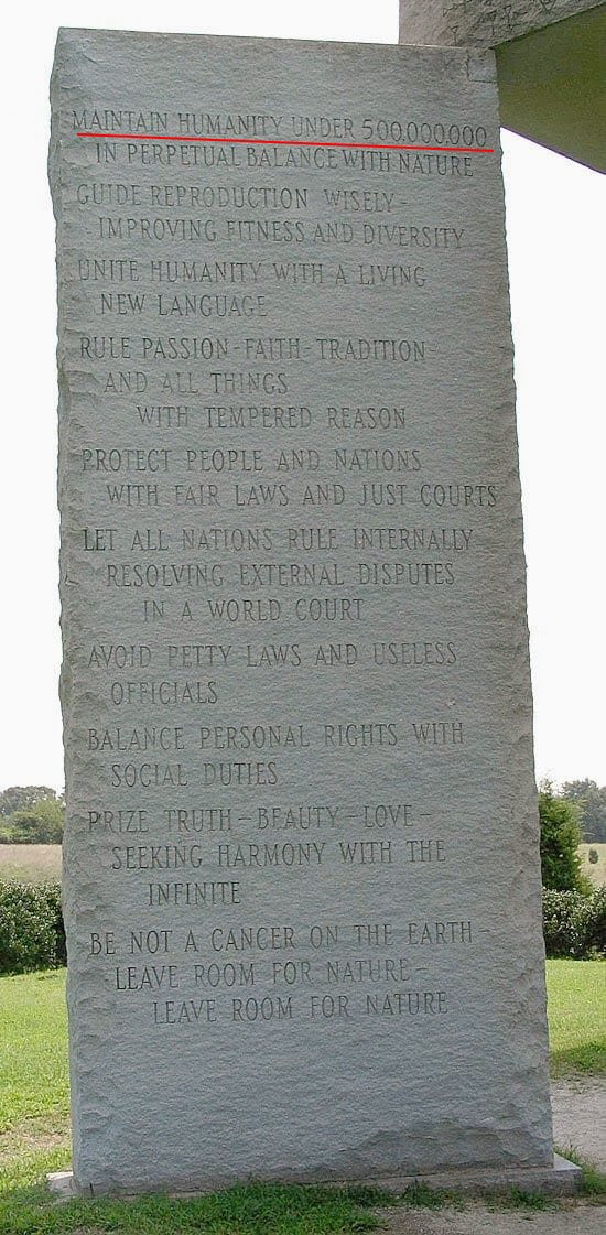 1. Maintain humanity under 500,000,000 in perpetual balance with nature 자연과의 영구적 균형을 위해 인구 5억 밑으로 유지한다