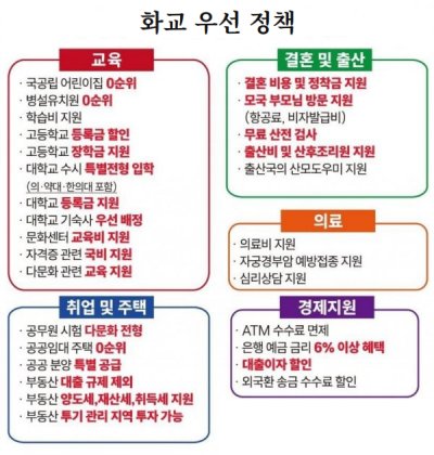 외국인에 적용했던 각종 규제를 철폐. '외국인 토지법' 폐지, 화교 학교도 '정식' 교육기관으로 인정. 화교들에게 영주권 부여