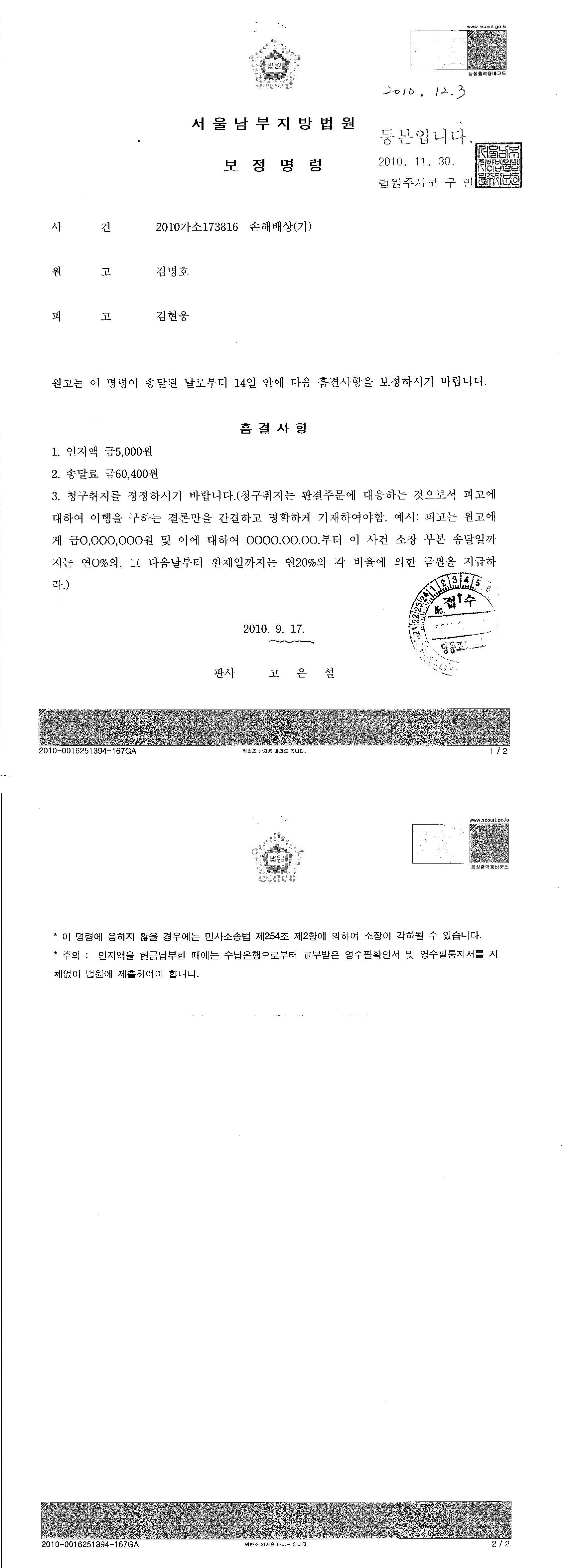 [2010.11.30] 원고 김명호에게 보정명령(인지대)등본 발송