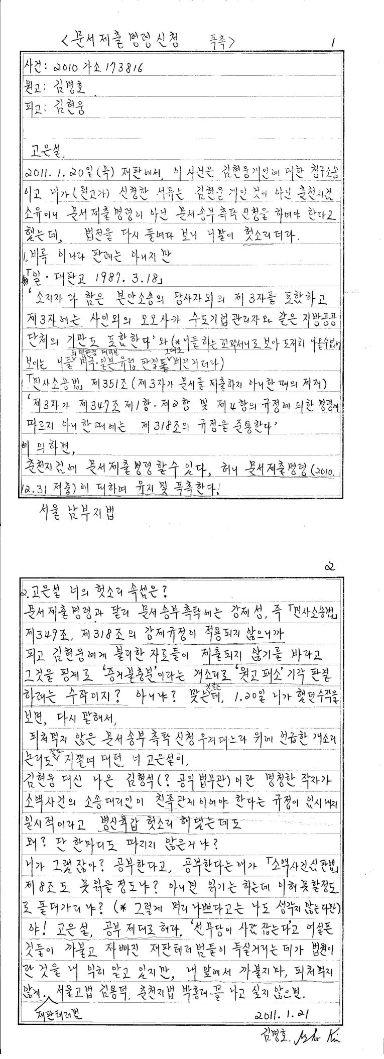 [2011.01.24] 원고 김명호 문서제출명령신청독촉 제출