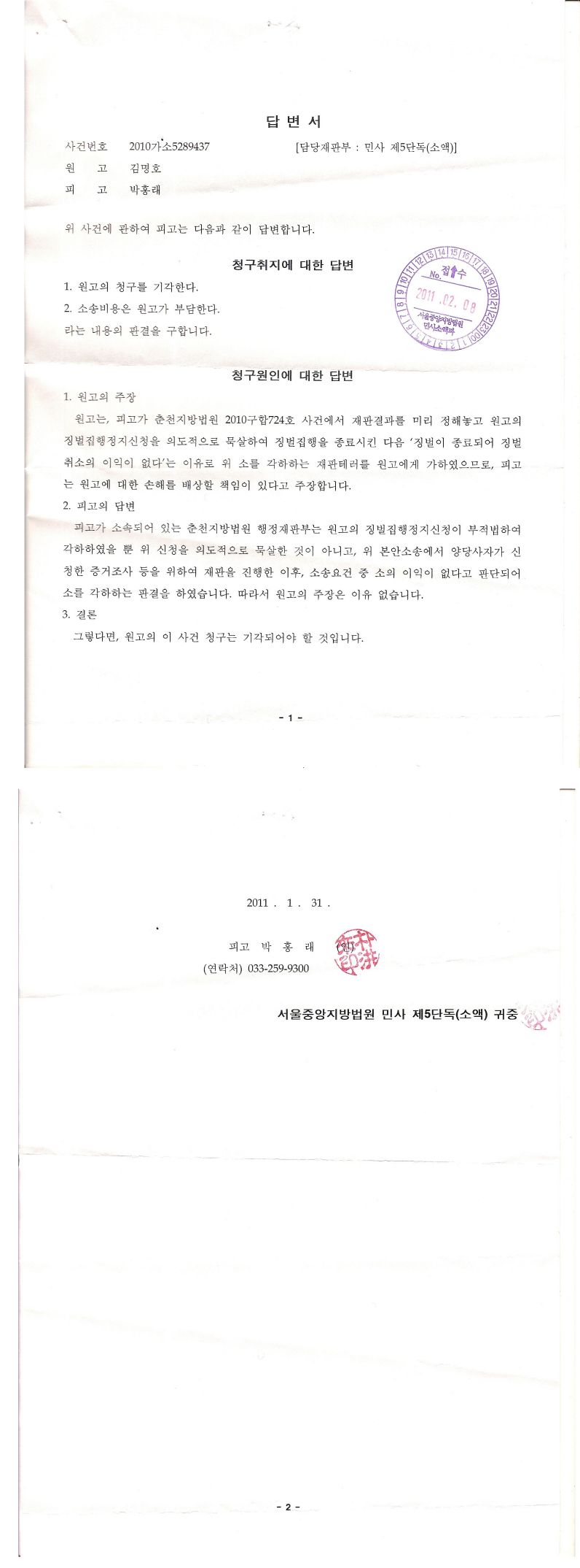 (* 참고: 김용덕에게 보낸 석명준비명령 답변)