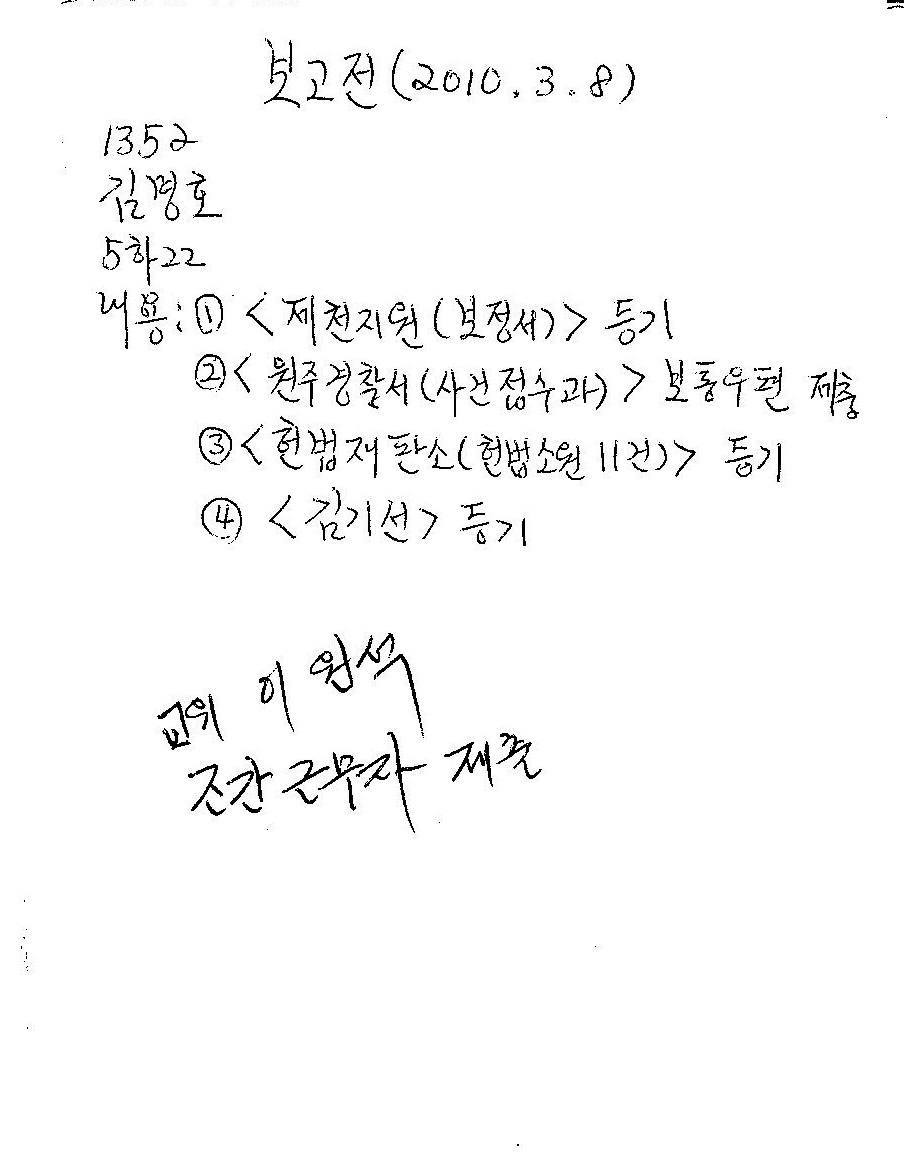 3. 참고로, 서신들과 함께 3.8일 함께 제출한 보고전(원주경찰서(사건접수과) 보통우편이 바로 '이복규에 대한 고소장'이고, 밑에 '교위 이원석 조간 근무자 제출'은 이상흥 교위가 확인 서명한것)