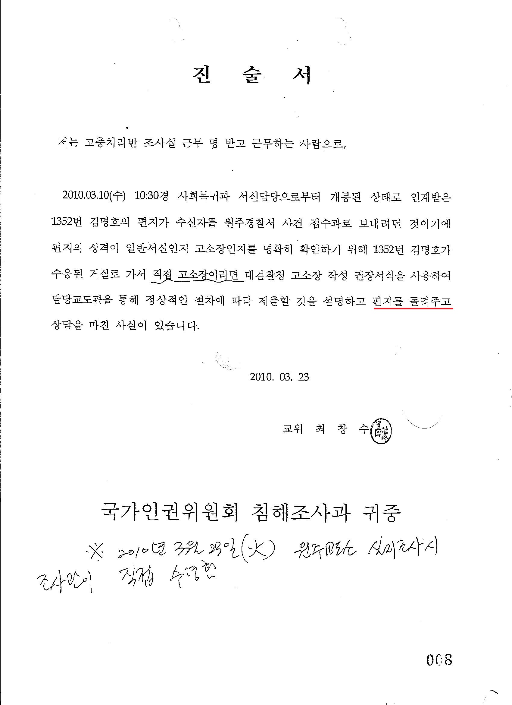 최창수 교위가 증거인멸하기 위하여 그 뜯겨진 서신을 내 던지고 갔고 원고는 이상흥 교위에게 다시 제출하였다. 그리고 그 고소장은 현재 행방불명, 즉 원주 경잘서에 접수되지도 않았으니 원주 교도소 놈들이 폐기시켜 버린 것.