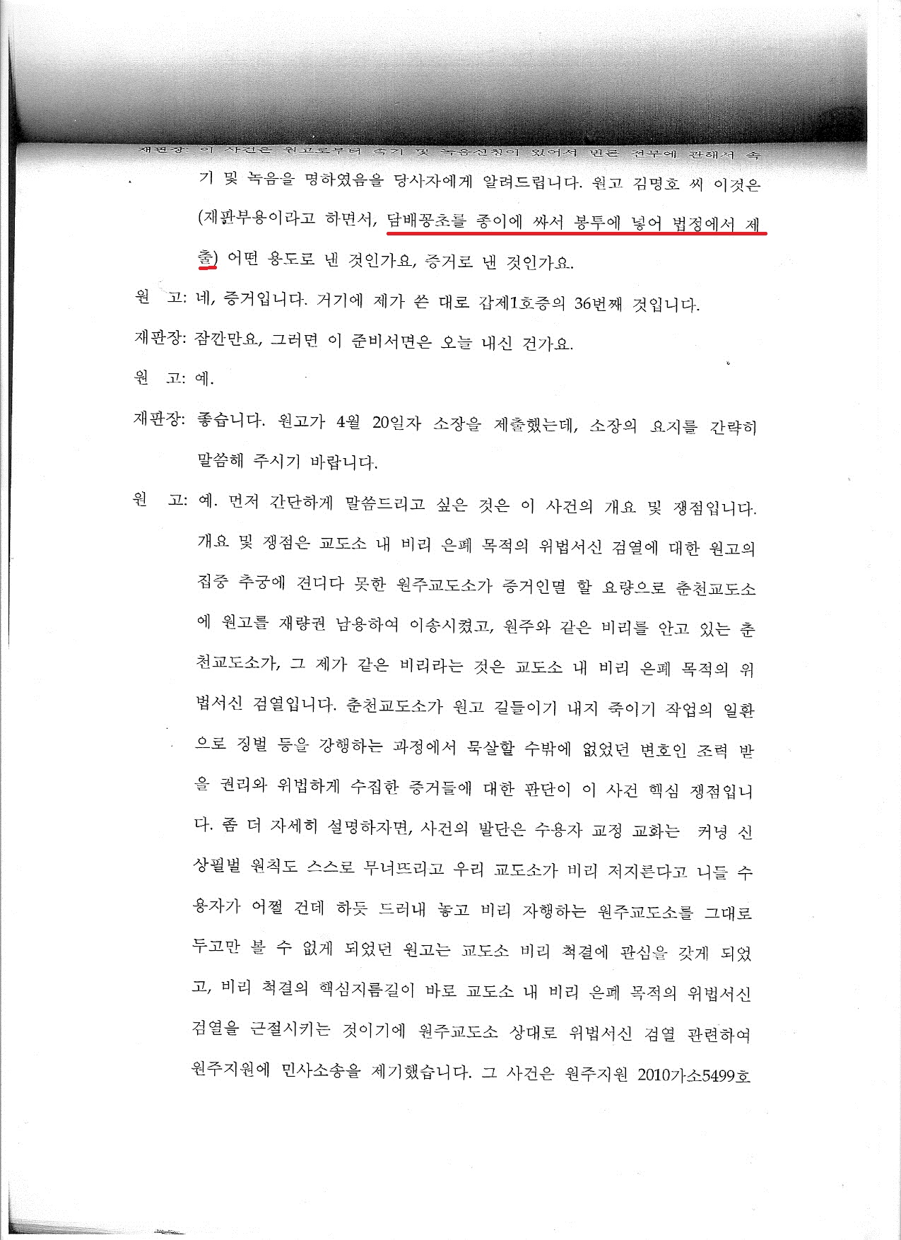 서신에 대한 국가인권위 결정문도 묵살하고 원주교도소의 위법한 담배 반입 은폐한 재판테러