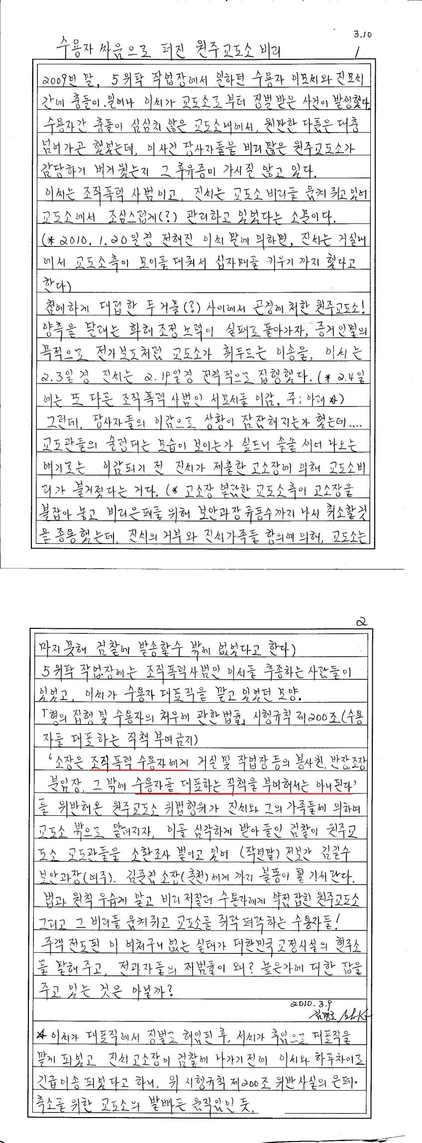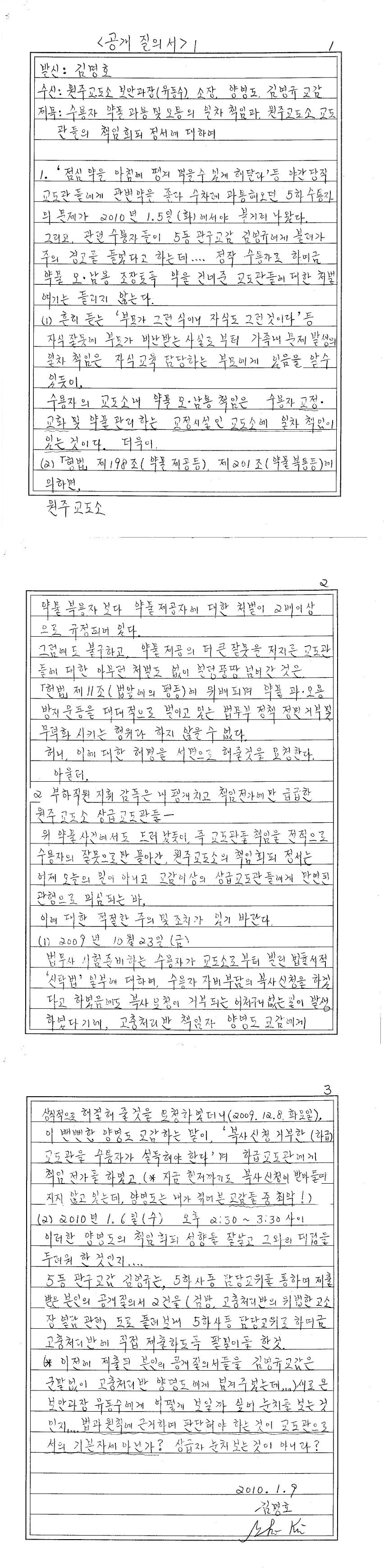 실상은 원동호 교도와 최창수 교위가 위법하게 뜯어 보고는, 2010년 3월 10일 오전 10시경