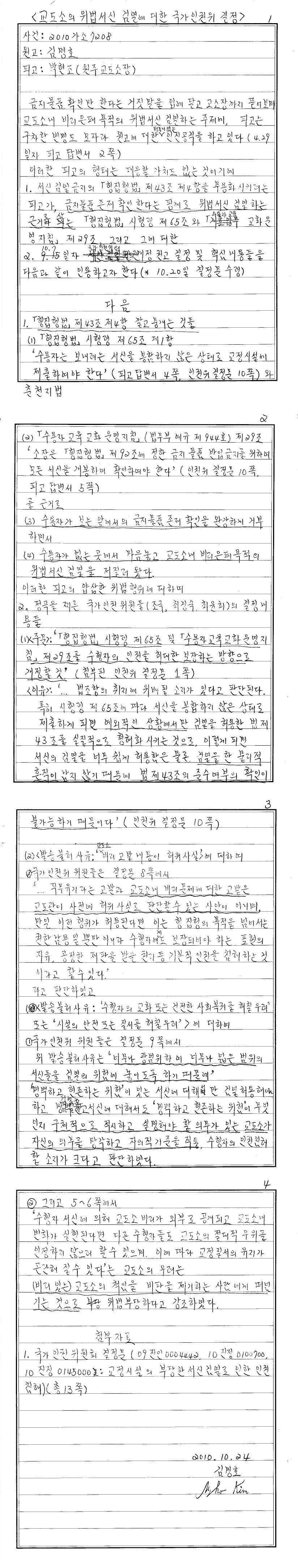 교도소의 위법서신 검열에 대한 국가인권위 결정문 제출