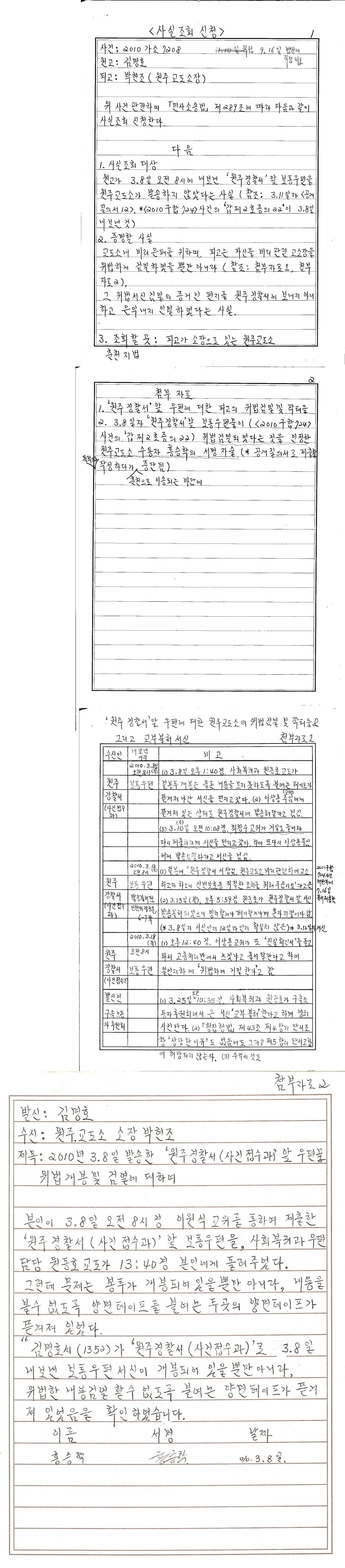 1. 박현조는 국가인권위 조사에서(10진정100700) 3.8일 제출한 서신을 '정상적으로 발송하였다'고 위 사실조회와 상반되는 진술 ☞ 국가 인권위 진술서