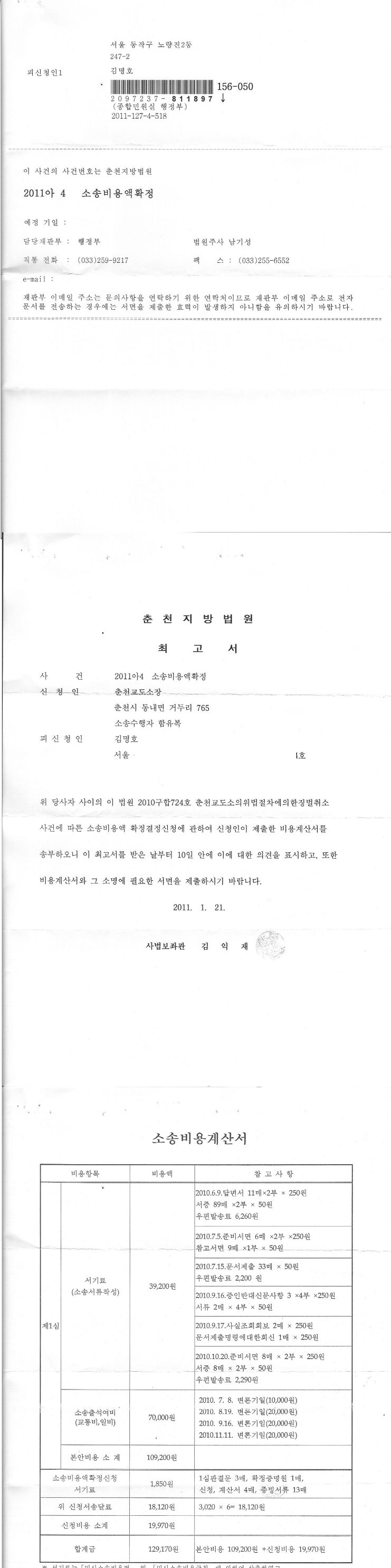 2011. 2. 17 최고서 수령(2011아4 소송비용액확정)