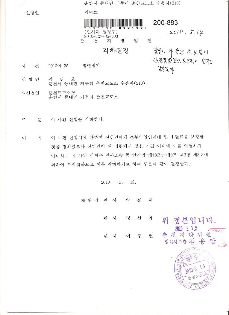 2010. 5. 12 박홍래의 만행(징벌이 끝난 날에 맞추어 배달되도록 만들어 놓고 뻔뻔스럽게 징벌집행정지 신청 각하)