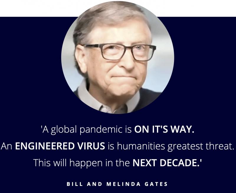 8. Bill And Melinda Gates Guaranteed An Imminent Global Pandemic In 2018 Bill Gates publicly announced that a global pandemic was on it’s way that could wipe out 30 million people. He said this would probably happen during the next decade. (4) Melinda Gates added that an engineered virus is humanities greatest threat and also assured this would hit humanity in the coming years. (5)‘A global pandemic is ON IT’S WAY. An ENGINEERED VIRUS is humanities greatest threat. This will happen in the NEXT DECADE.’ – BILL GATES, in 2018