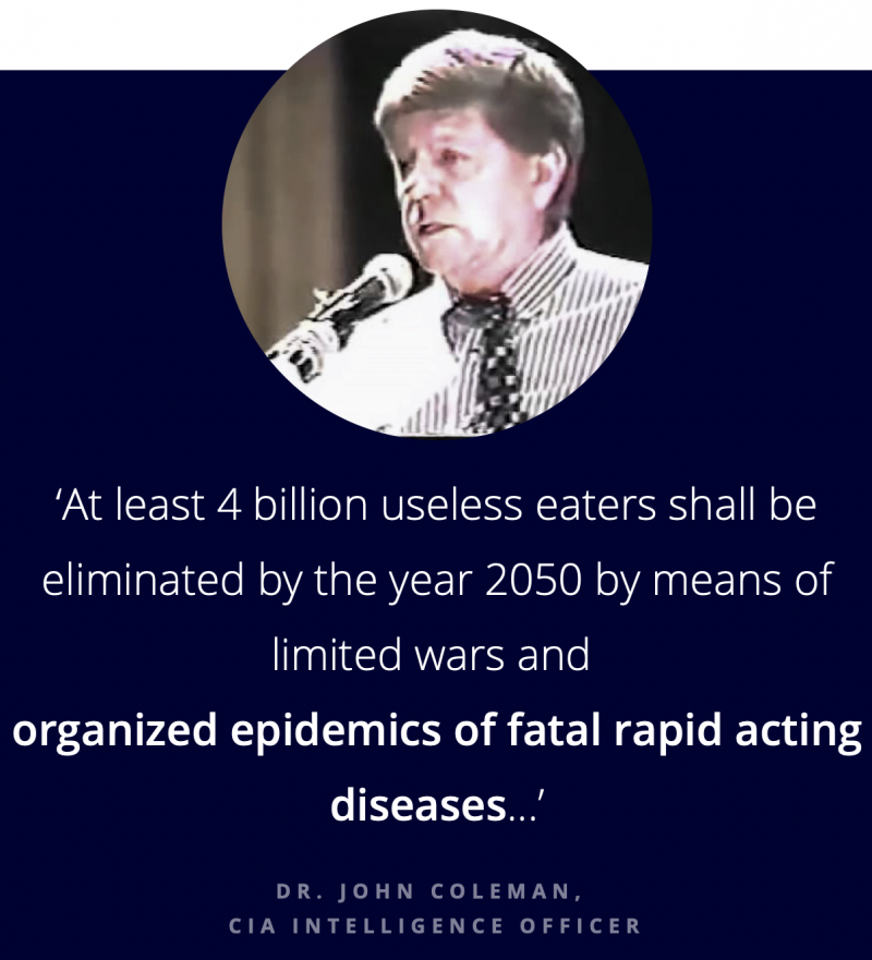 Depopulate The Earth By Means Of Organized Epidemics Dr. John Coleman is a famous Intelligence Officer from the CIA who wrote a book titled ‘The Committee of 300 ‘. In it he explains how secret societies manipulate governments, health care, food industries, the media and so on. This book can be found on the website of the CIA. (15)One of the primary goals of the many secret societies, that control governments and the media, is to depopulate the earth. You can find a list of 32 ‘elites’ who support and promote (according to their own claims) depopulation HERE .