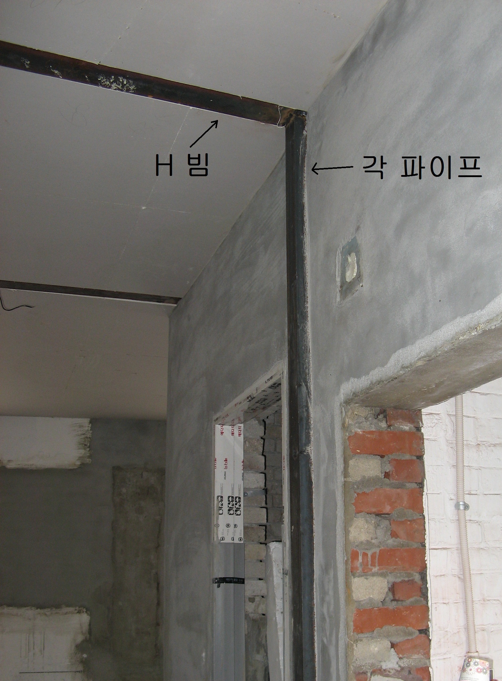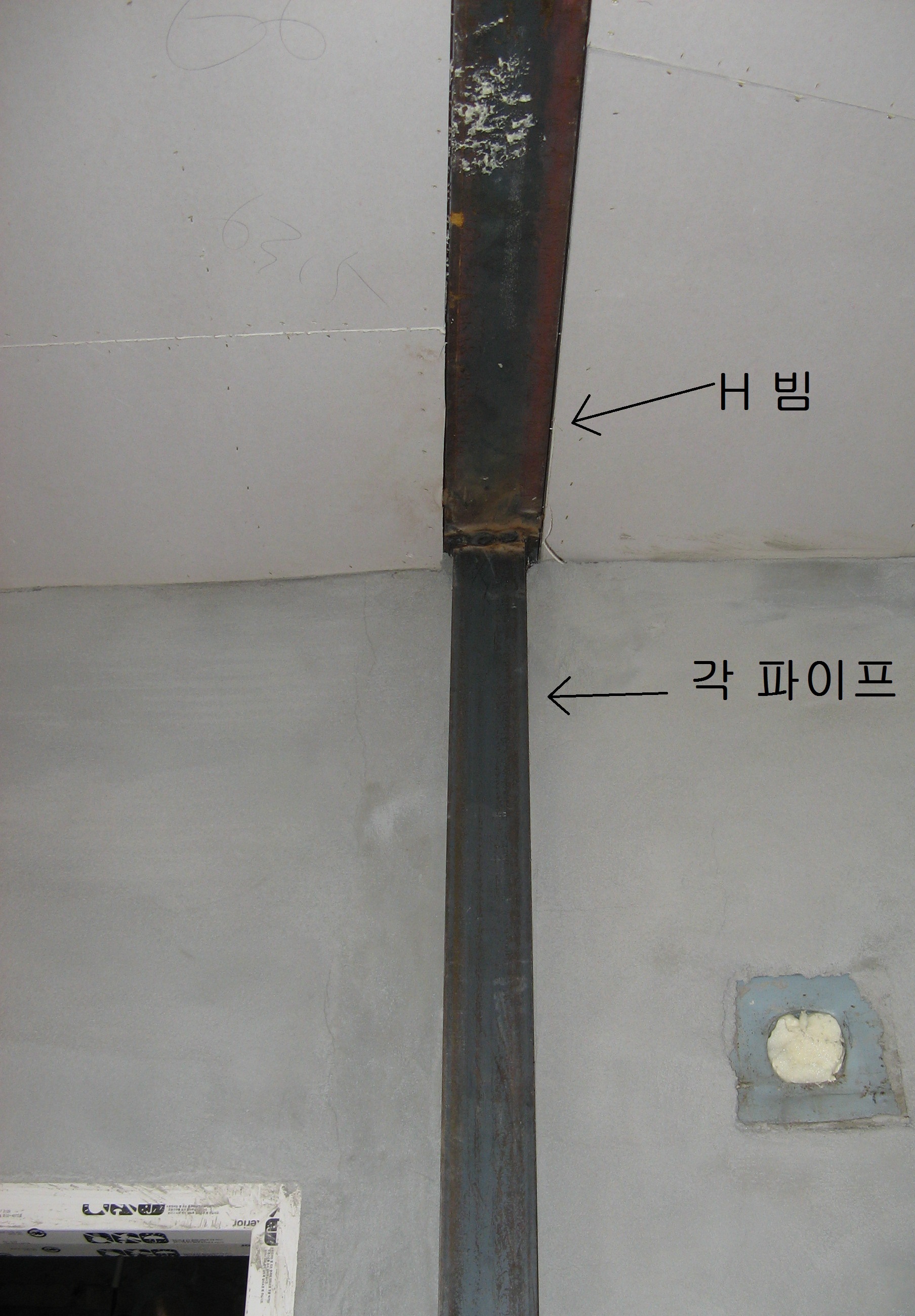 2. 웃기는 것은 그렇게도 구조를 생각하는 인간이 2층 천장을 떠 받드는 H 빔을 무엇으로 받쳐주었는가 보라.(아래 사진)