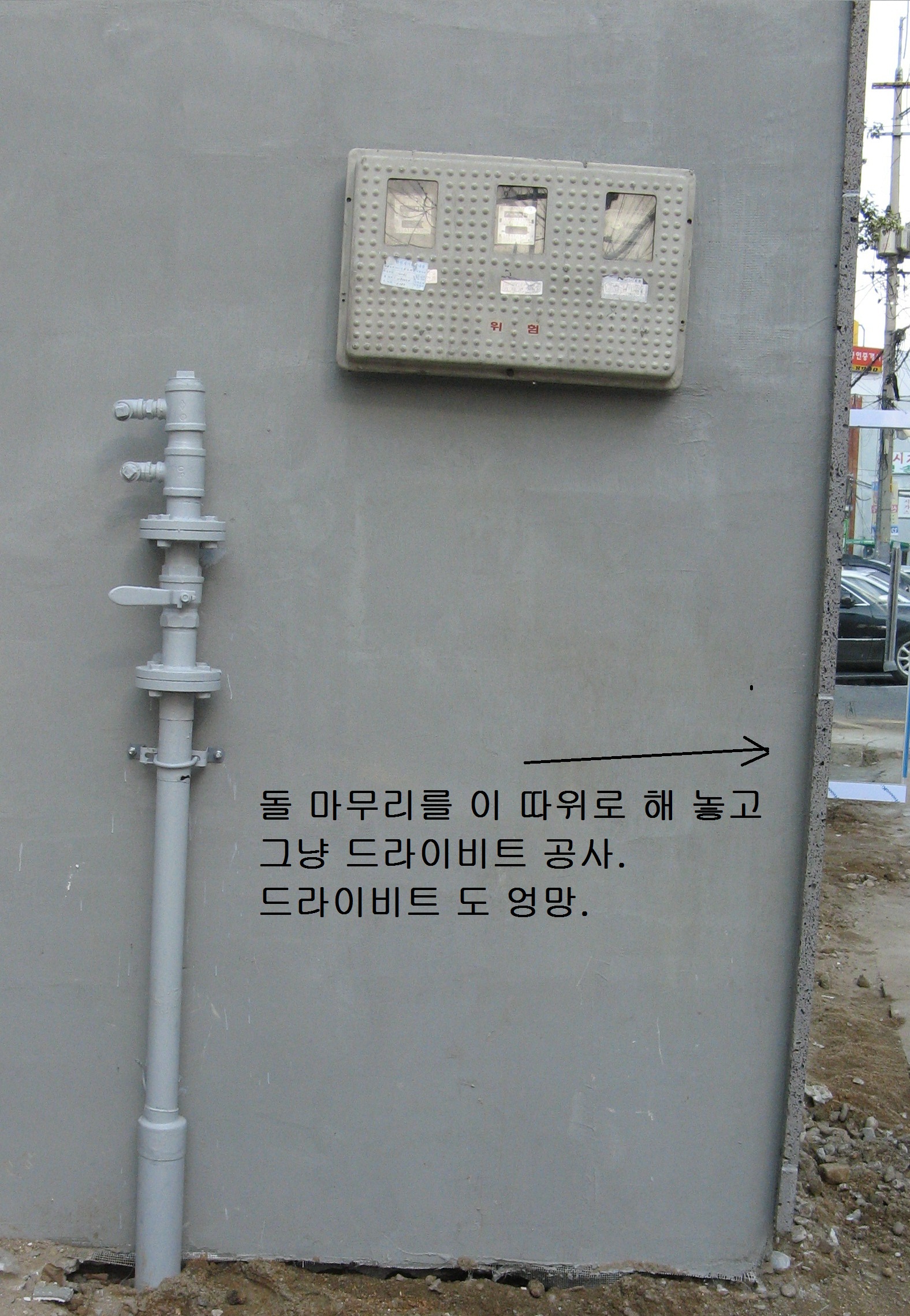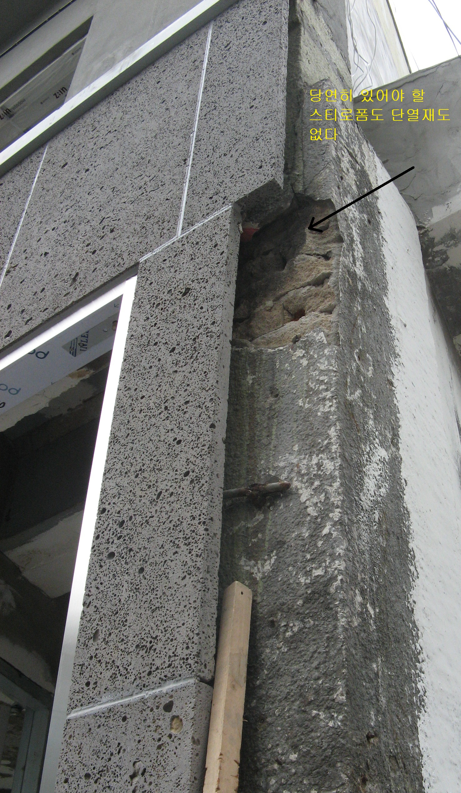 8. 돌을 붙이는 공사에서 돌을 벽에다 붙일 때에는 스티로폼 또는 단열재로 싸고 나서 그 위에 돌을 붙여야 함에도 불구하고 그냥 벽위에 돌을 붙임으로 써, 단열은 커녕 주먹으로 치기만 해도 돌이 깨지도록 방치.