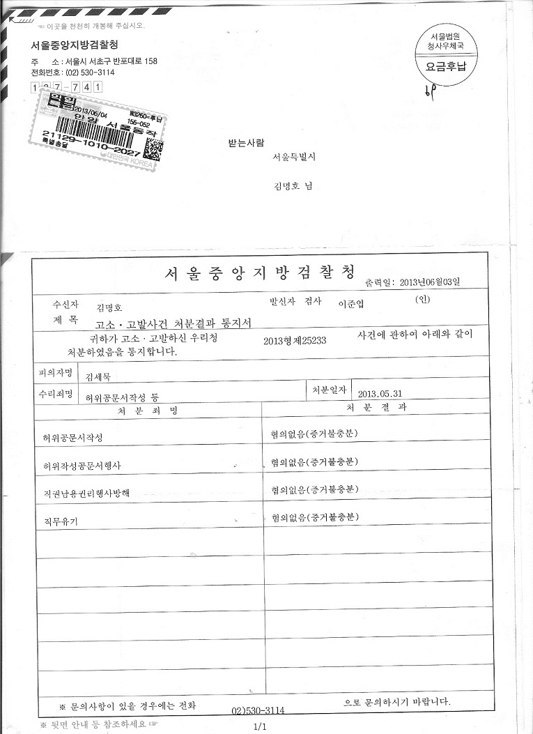예상한 대로, 3.19일 '증거불충분'이라는 개소리로 불기소 처분(서울중앙지검 2013형제19071, 3.21일 수령).