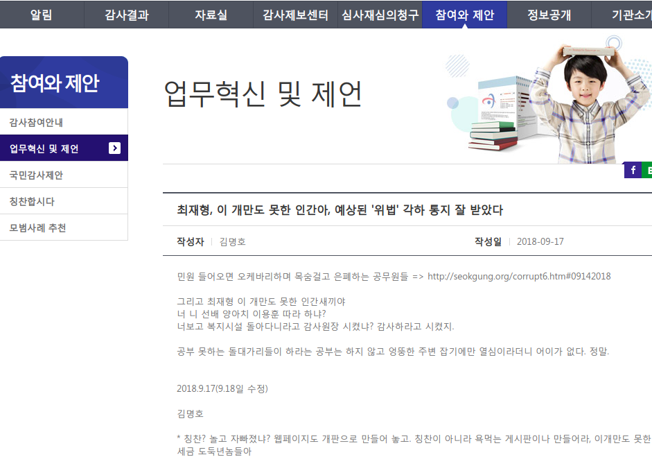 김황식 등이 원장을 지냈다는 감사원 웹페이지를 보니, 완전 쓰레기통의 전통을 이어가는 듯하다.