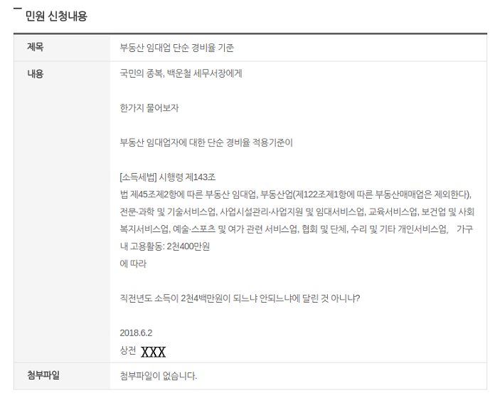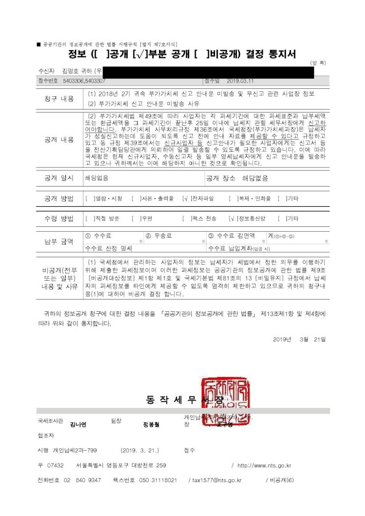 아래와 같이 인터넷으로 정보공개청구(접수번호 5403306, 담당 서울지방국세청 오민숙, 12일 접수)
