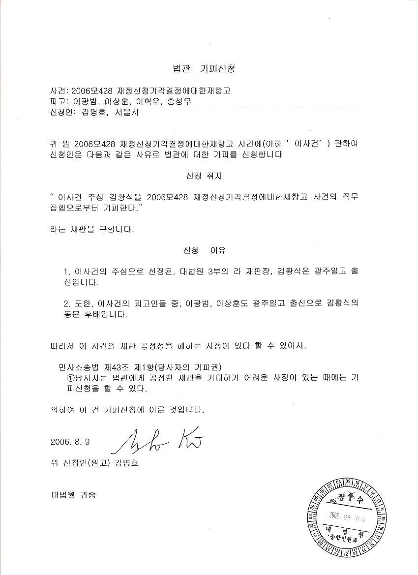 2. 김황식 법관, 기피 신청 기각(주심: 전수안)