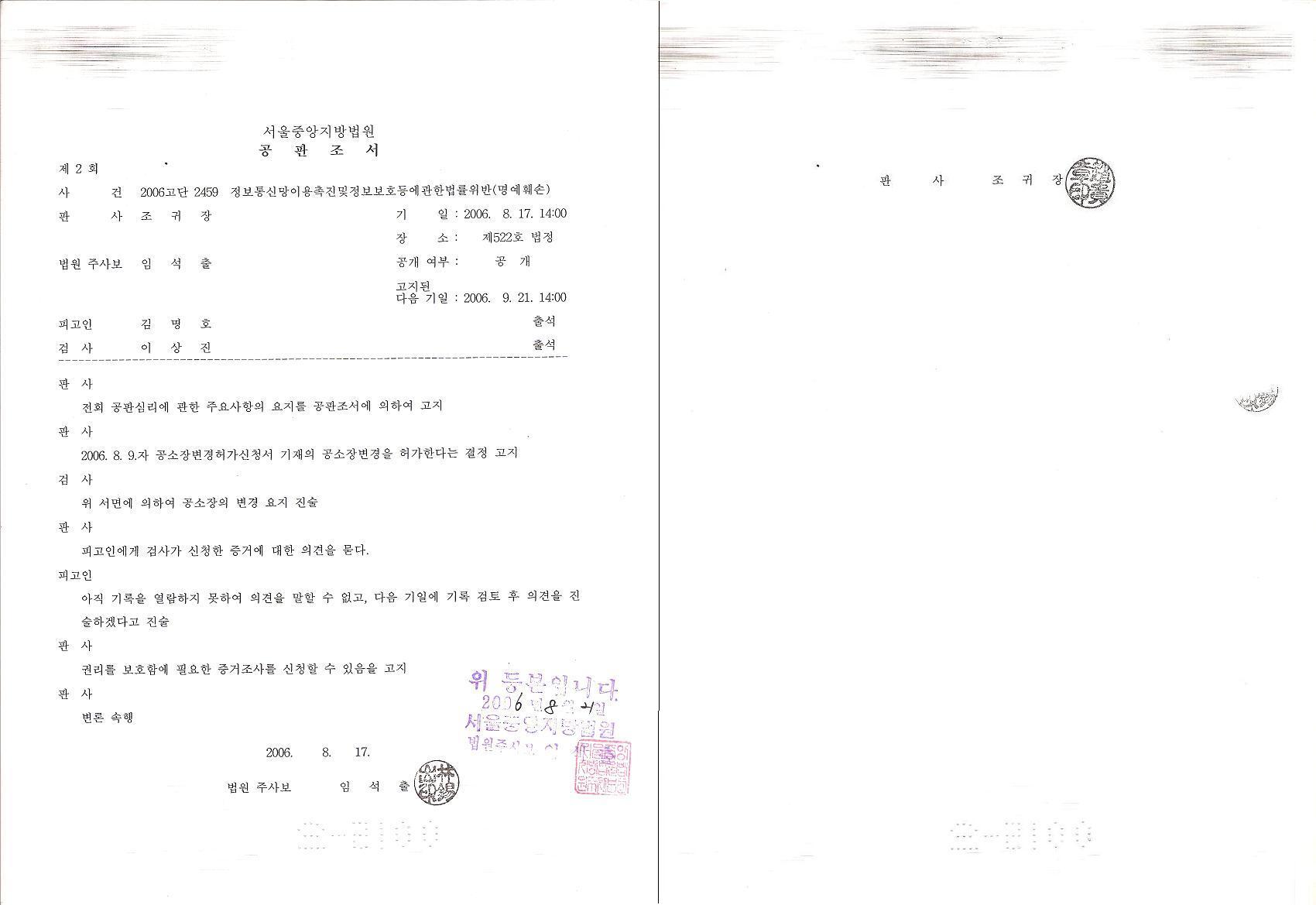 1. 8월 17일자, 공판조서 등본에 대한