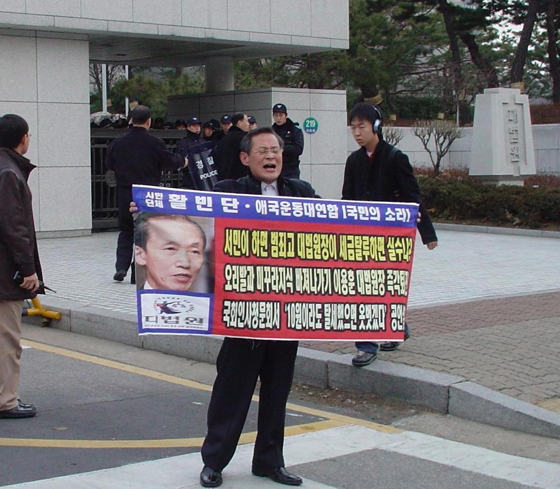 전에 서울고법에서 "서울고법 이윤승 판사 재판이냐 개판이냐"이라는 구호로 시위하던 사람이