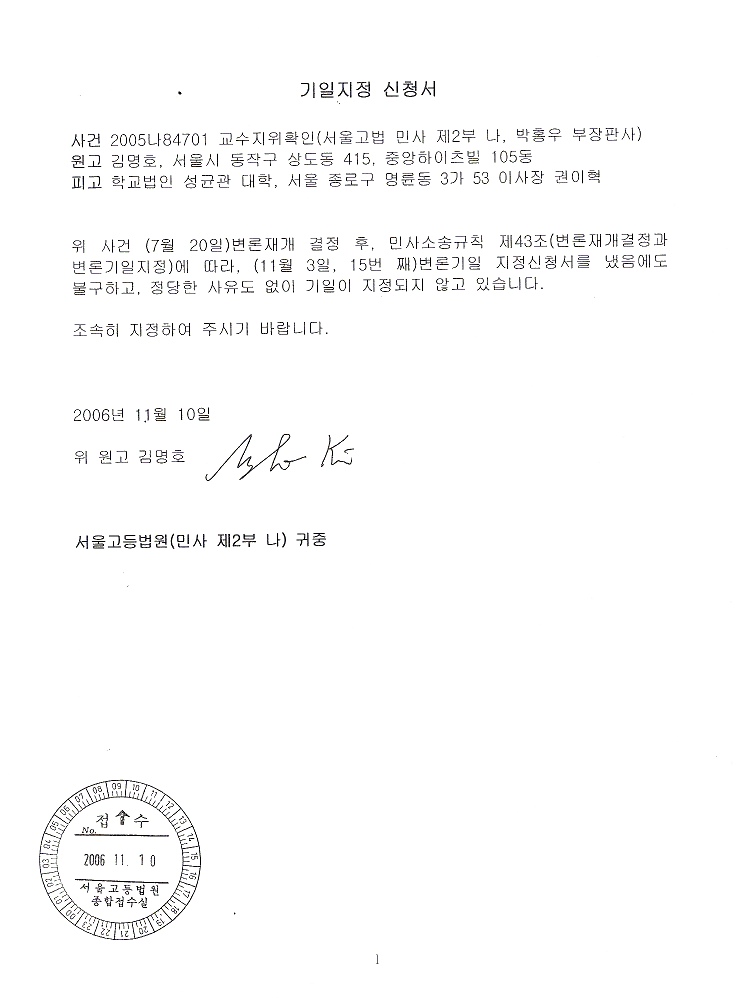 주: 11월 13일 서울중앙지법 앞에서 9:30-10시 사이에 정달영 교수 만났음.