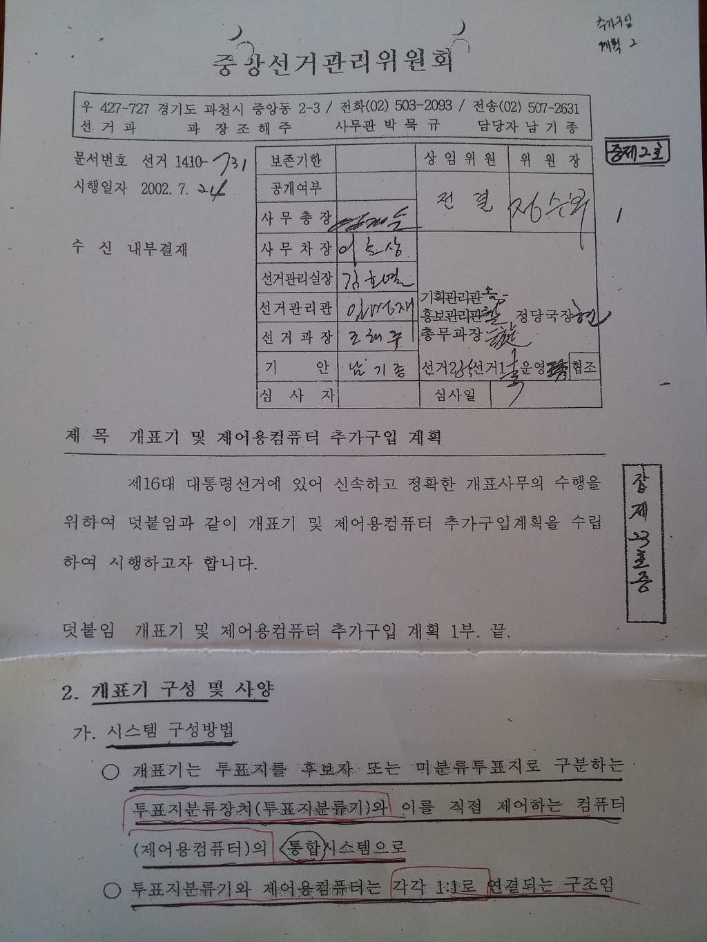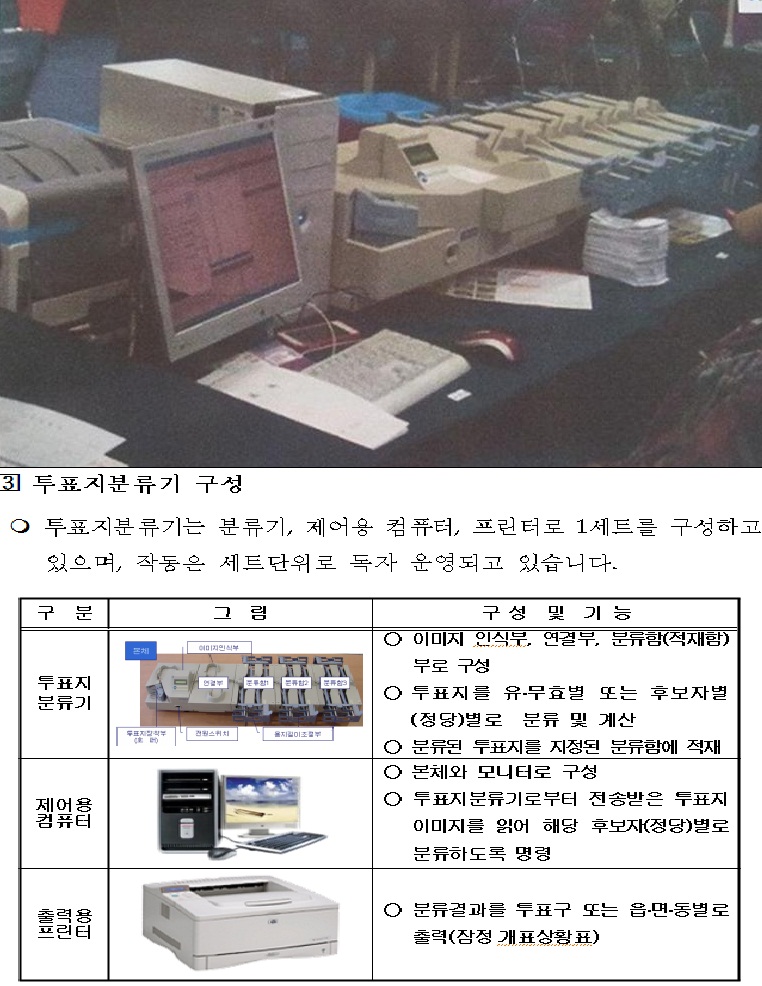 * 전자개표기= 투표지분류기(hardware)+ 제어용컴퓨터(software)를 입증하는 중앙선관위 문서번호 '선거 1410-731'