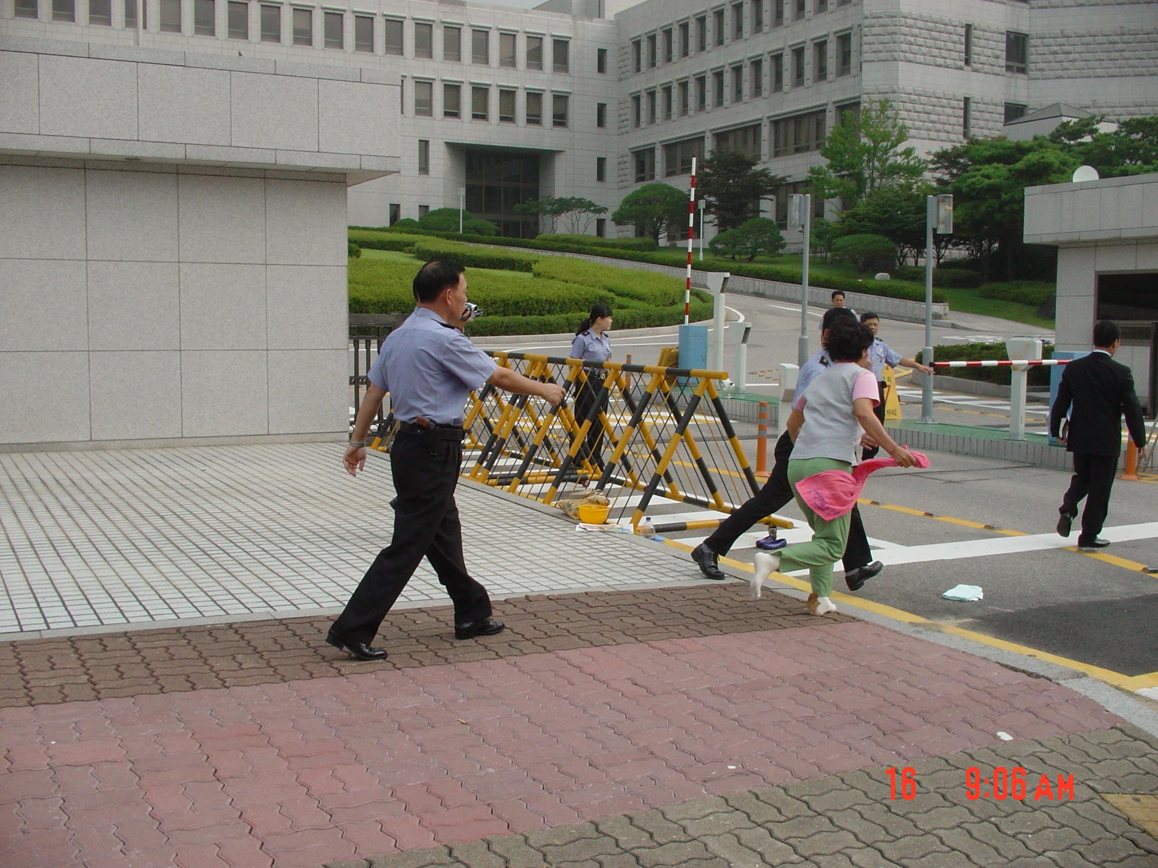 찍어 찍어 하며 도망가는 대법원 직원, 떨어져 보이는 것이 KBS 중계차