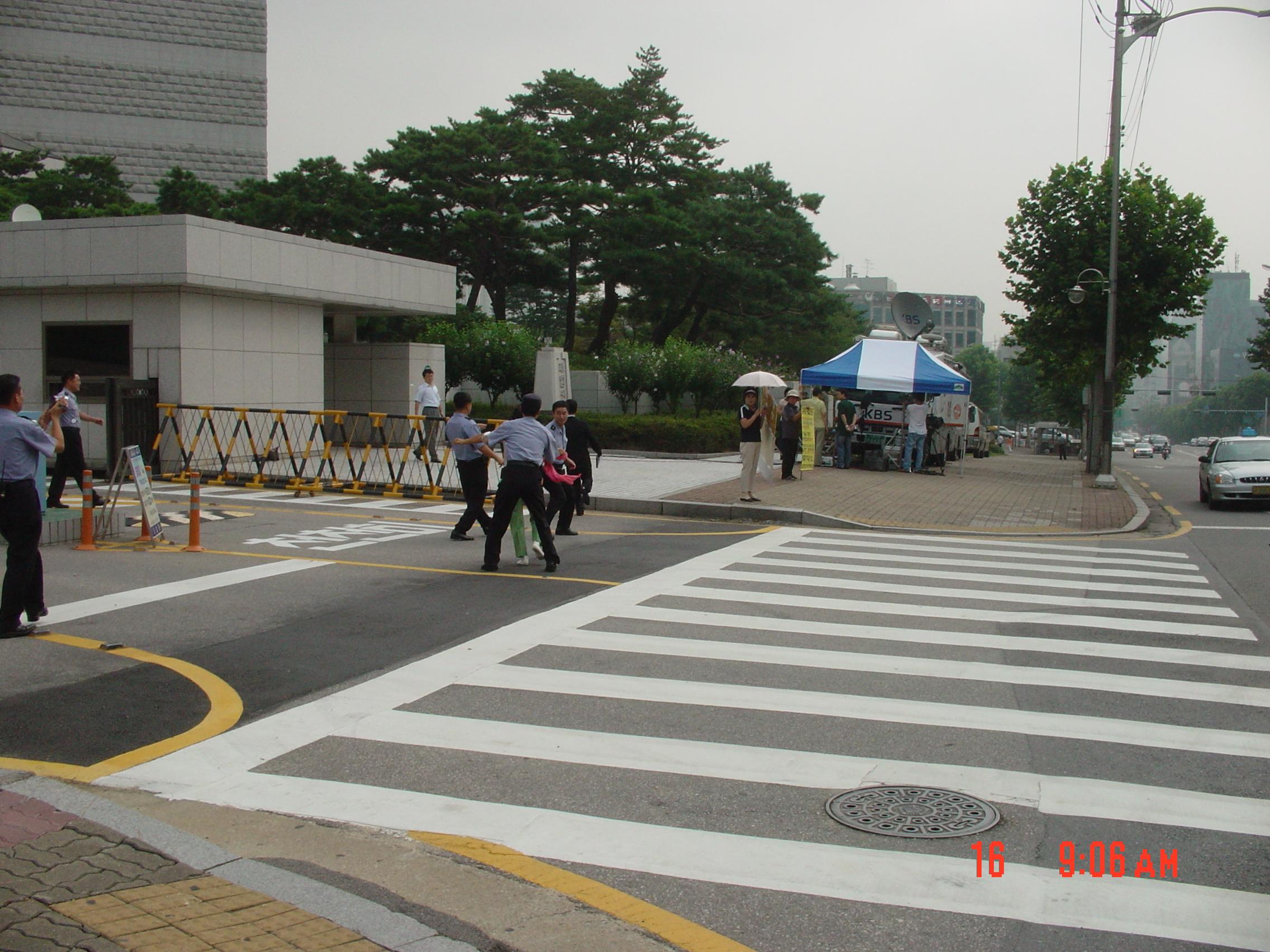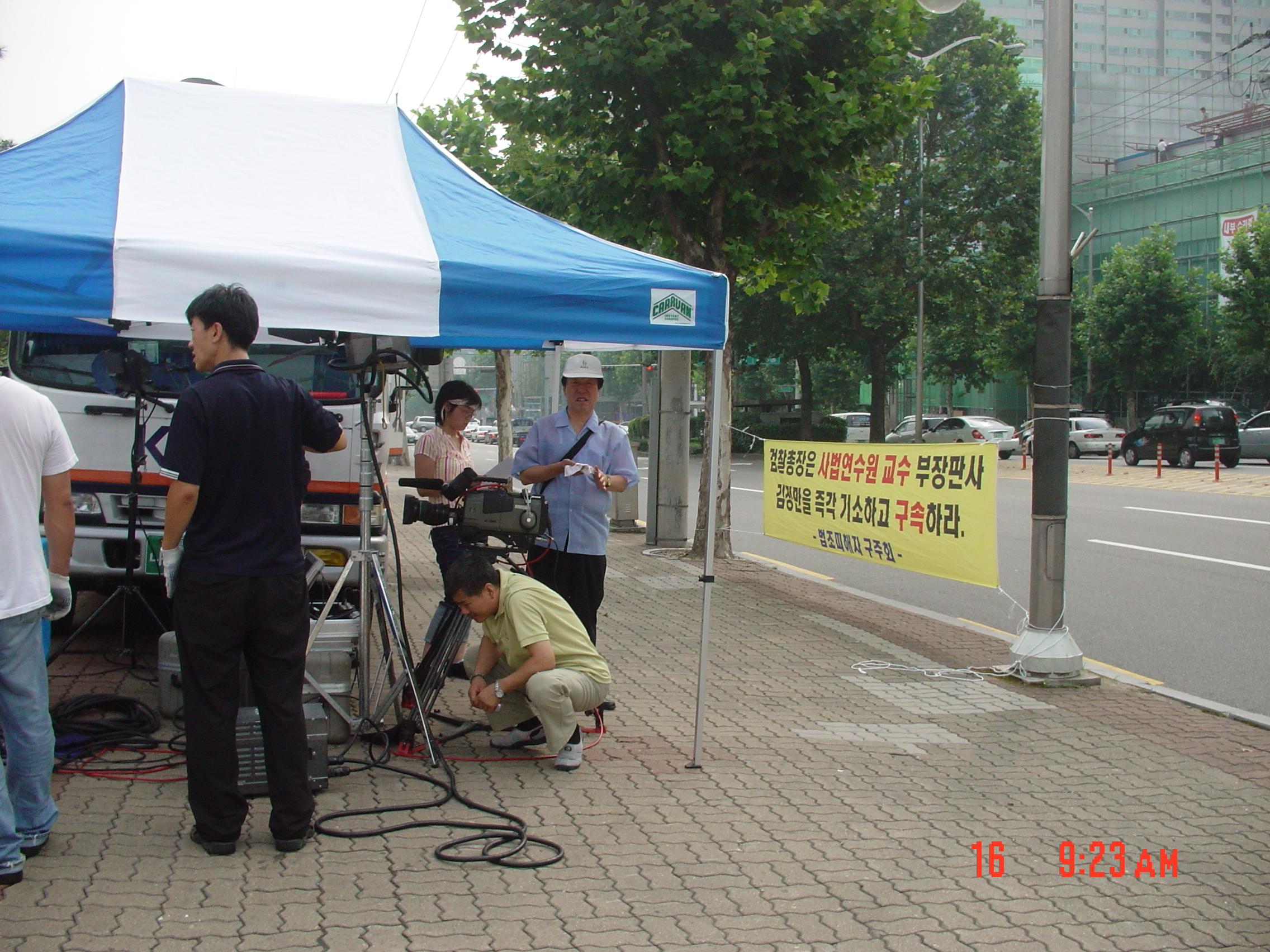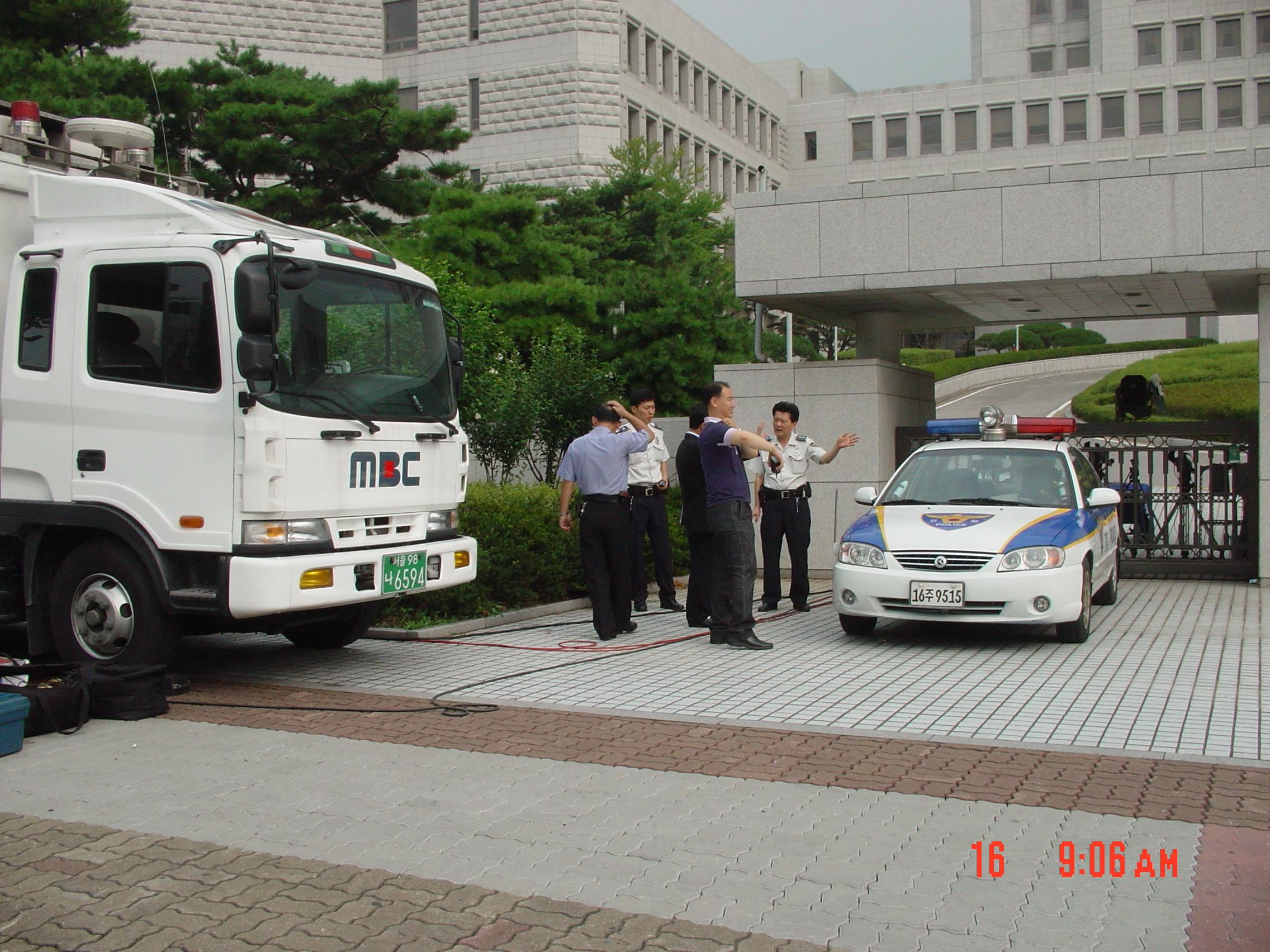 고자질(?) 경찰한테 부산아주머니에 대하여 뭐라고 하는 법원직원(까만 양복), 옆에 보이는 것이 MBC 중계차