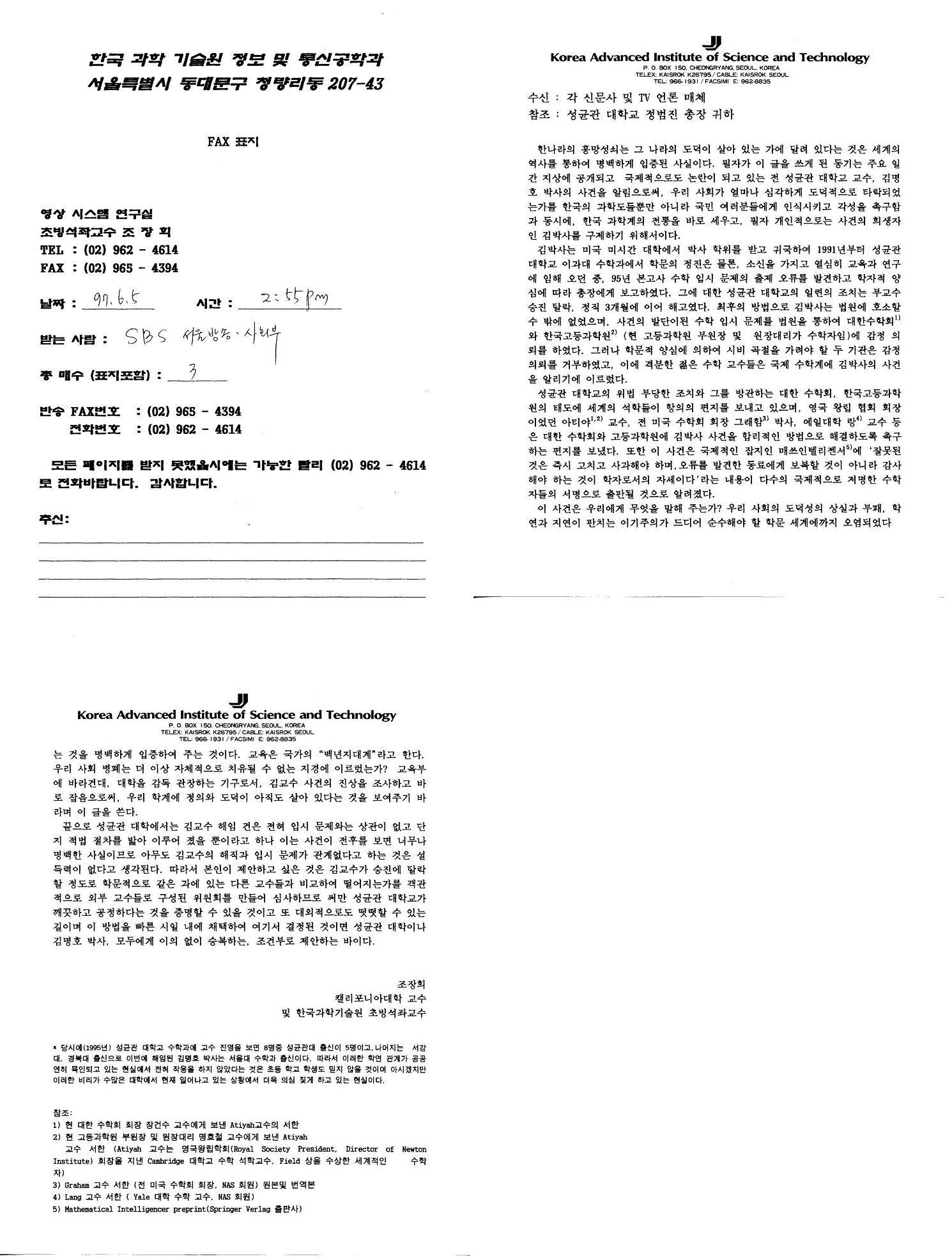 주진구 교수)와 고등과학원(주: 원장대리 명효철 수학교수 ) 등에 수학문제의 검토를 요구했지만 두