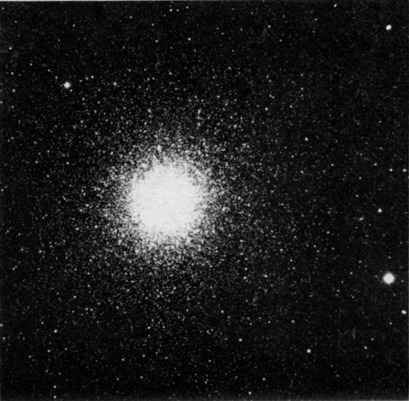What if the stars are too far away for us to use triangulation? Astronomers are always inventing new ways of measuring distance. They find, for example, that they can estimate the size and brightness of a star by its color. The color and brightness of many nearby stars—whose distances are known by triangulation—have been measured, and it is found that there is a smooth relationship between the color and the intrinsic brightness of stars (in most cases). If one now measures the color of a distant star, one may use the color-brightness relationship to determine the intrinsic brightness of the star. By measuring how bright the star appears to us at the earth (or perhaps we should say how dim it appears), we can compute how far away it is. (For a given intrinsic brightness, the apparent brightness decreases with the square of the distance.) A nice confirmation of the correctness of this method of measuring stellar distances is given by the results obtained for groups of stars known as globular clusters. A photograph of such a group is shown in Fig. 5–6. Just from looking at the photograph one is convinced that these stars are all together. The same result is obtained from distance measurements by the color-brightness method.