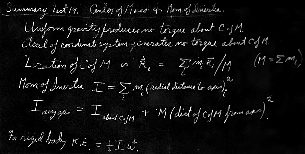 Let us now return to the center of mass. The center of mass is sometimes called the center of gravity, for the reason that, in many cases, gravity may be considered uniform. Let us suppose that we have small enough dimensions that the gravitational force is not only proportional to the mass, but is everywhere parallel to some fixed line. Then consider an object in which there are gravitational forces on each of its constituent masses. Let $m_i$ be the mass of one part. Then the gravitational force on that part is $m_i$ times $g$. Now the question is, where can we apply a single force to balance the gravitational force on the whole thing, so that the entire object, if it is a rigid body, will not turn? The answer is that this force must go through the center of mass, and we show this in the following way. In order that the body will not turn, the torque produced by all the forces must add up to zero, because if there is a torque, there is a change of angular momentum, and thus a rotation. So we must calculate the total of all the torques on all the particles, and see how much torque there is about any given axis; it should be zero if this axis is at the center of mass. Now, measuring $x$ horizontally and $y$ vertically, we know that the torques are the forces in the $y$-direction, times the lever arm $x$ (that is to say, the force times the lever arm around which we want to measure the torque). Now the total torque is the sum \begin{equation} \label{Eq:I:19:3} \tau=\sum m_igx_i=g\sum m_ix_i, \end{equation} so if the total torque is to be zero, the sum $\sum m_ix_i$ must be zero. But $\sum m_ix_i = MX_{\text{CM}}$, the total mass times the distance of the center of mass from the axis. Thus the $x$-distance of the center of mass from the axis is zero.
