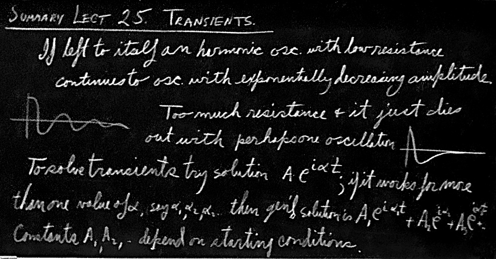 We now turn to our main topic of discussion: transients. By a transient is meant a solution of the differential equation when there is no force present, but when the system is not simply at rest. (Of course, if it is standing still at the origin with no force acting, that is a nice problem—it stays there!) Suppose the oscillation starts another way: say it was driven by a force for a while, and then we turn off the force. What happens then? Let us first get a rough idea of what will happen for a very high $Q$ system. So long as a force is acting, the stored energy stays the same, and there is a certain amount of work done to maintain it. Now suppose we turn off the force, and no more work is being done; then the losses which are eating up the energy of the supply are no longer eating up its energy—there is no more driver. The losses will have to consume, so to speak, the energy that is stored. Let us suppose that $Q/2\pi = 1000$. Then the work done per cycle is $1/1000$ of the stored energy. Is it not reasonable, since it is oscillating with no driving force, that in one cycle the system will still lose a thousandth of its energy $E$, which ordinarily would have been supplied from the outside, and that it will continue oscillating, always losing $1/1000$ of its energy per cycle? So, as a guess, for a relatively high $Q$ system, we would suppose that the following equation might be roughly right (we will later do it exactly, and it will turn out that it was right!): \begin{equation} \label{Eq:I:24:8} dE/dt=-\omega E/Q. \end{equation} This is rough because it is true only for large $Q$. In each radian the system loses a fraction $1/Q$ of the stored energy $E$. Thus in a given amount of time $dt$ the energy will change by an amount $\omega\,dt/Q$, since the number of radians associated with the time $dt$ is $\omega\,dt$. What is the frequency? Let us suppose that the system moves so nicely, with hardly any force, that if we let go it will oscillate at essentially the same frequency all by itself. So we will guess that $\omega$ is the resonant frequency $\omega_0$. Then we deduce from Eq. (24.8) that the stored energy will vary as \begin{equation} \label{Eq:I:24:9} E=E_0e^{-\omega_0t/Q}=E_0e^{-\gamma t}. \end{equation} This would be the measure of the energy at any moment. What would the formula be, roughly, for the amplitude of the oscillation as a function of the time? The same? No! The amount of energy in a spring, say, goes as the square of the displacement; the kinetic energy goes as the square of the velocity; so the total energy goes as the square of the displacement. Thus the displacement, the amplitude of oscillation, will decrease half as fast because of the square. In other words, we guess that the solution for the damped transient motion will be an oscillation of frequency close to the resonance frequency $\omega_0$, in which the amplitude of the sine-wave motion will diminish as $e^{-\gamma t/2}$: \begin{equation} \label{Eq:I:24:10} x=A_0e^{-\gamma t/2}\cos\omega_0 t. \end{equation} This equation and Fig. 24–1 give us an idea of what we should expect; now let us try to analyze the motion precisely by solving the differential equation of the motion itself.
