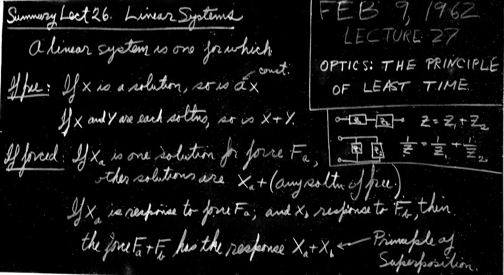 The reason why this is true in electricity is that the great laws of electricity, Maxwell’s equations, which determine the electric field, turn out to be differential equations which are linear, i.e., which have the property (25.3). What corresponds to the force is the charge generating the electric field, and the equation which determines the electric field in terms of the charge is linear.