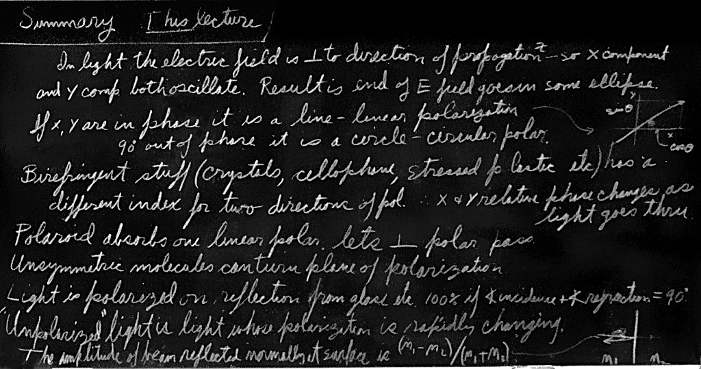 We have considered linearly, circularly, and elliptically polarized light, which covers everything except for the case of unpolarized light. Now how can the light be unpolarized when we know that it must vibrate in one or another of these ellipses? If the light is not absolutely monochromatic, or if the $x$- and $y$-phases are not kept perfectly together, so that the electric vector first vibrates in one direction, then in another, the polarization is constantly changing. Remember that one atom emits during $10^{-8}$ sec, and if one atom emits a certain polarization, and then another atom emits light with a different polarization, the polarizations will change every $10^{-8}$ sec. If the polarization changes more rapidly than we can detect it, then we call the light unpolarized, because all the effects of the polarization average out. None of the interference effects of polarization would show up with unpolarized light. But as we see from the definition, light is unpolarized only if we are unable to find out whether the light is polarized or not.