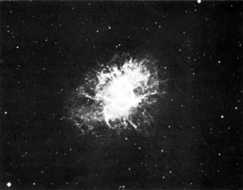In the year 1054 the Chinese and Japanese civilizations were among the most advanced in the world; they were conscious of the external universe, and they recorded, most remarkably, an explosive bright star in that year. (It is amazing that none of the European monks, writing all the books of the middle ages, even bothered to write that a star exploded in the sky, but they did not.) Today we may take a picture of that star, and what we see is shown in Fig. 34–7. On the outside is a big mass of red filaments, which is produced by the atoms of the thin gas “ringing” at their natural frequencies; this makes a bright line spectrum with different frequencies in it. The red happens in this case to be due to nitrogen. On the other hand, in the central region is a mysterious, fuzzy patch of light in a continuous distribution of frequency, i.e., there are no special frequencies associated with particular atoms. Yet this is not dust “lit up” by nearby stars, which is one way by which one can get a continuous spectrum. We can see stars through it, so it is transparent, but it is emitting light.