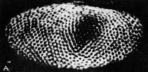 Let us now return to biology. The human eye is not the only kind of eye. In the vertebrates, almost all eyes are essentially like the human eye. However, in the lower animals there are many other kinds of eyes: eye spots, various eye cups, and other less sensitive things, which we have no time to discuss. But there is one other highly developed eye among the invertebrates, the compound eye of the insect. (Most insects having large compound eyes also have various additional simpler eyes as well.) A bee is an insect whose vision has been studied very carefully. It is easy to study the properties of the vision of bees because they are attracted to honey, and we can make experiments in which we identify the honey by putting it on blue paper or red paper, and see which one they come to. By this method some very interesting things have been discovered about the vision of the bee.