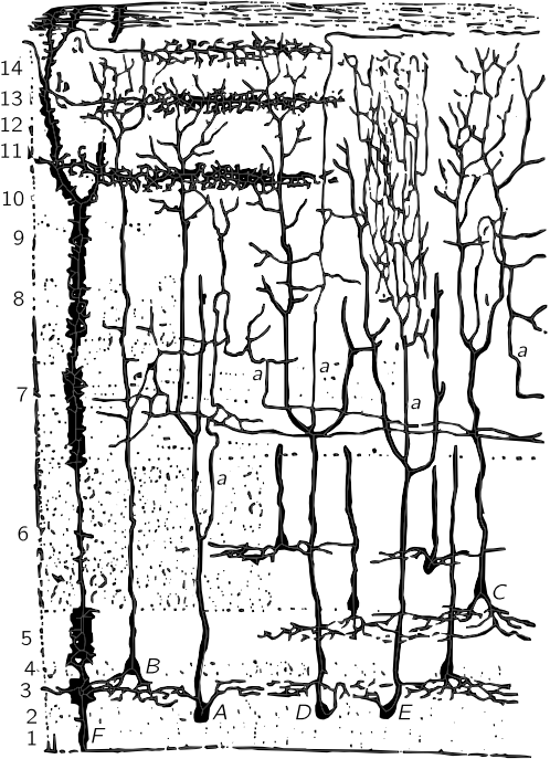 Figure 36–14 shows the surface of the so-called tectum of a frog, where the nerves come into the brain from the optic nerve. All the nerve fibers coming in from the optic nerve make connections in various layers of the tectum. This layered structure is analogous to the retina; that is partly why we know that the brain and retina are very similar. Now, by taking an electrode and moving it down in succession through the layers, we can find out which kinds of optic nerves end where, and the beautiful and wonderful result is that the different kinds of fibers end in different layers! The first ones end in number $1$ type, the second in number $2$, the threes and fives end in the same place, and deepest of all is number four. (What a coincidence, they got the numbers almost in the right order! No, that is why they numbered them that way, the first paper had the numbers in a different order!)