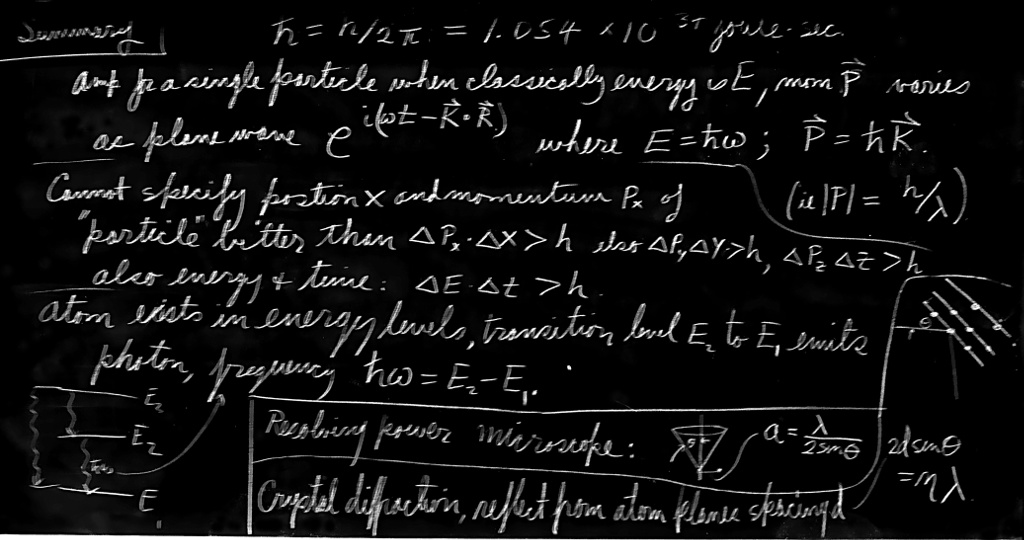 In a special case the amplitude varies sinusoidally in space and time like $e^{i(\omega t - \FLPk\cdot\FLPr)}$ (do not forget that these amplitudes are complex numbers, not real numbers) and involves a definite frequency $\omega$ and wave number $\FLPk$. Then it turns out that this corresponds to a classical limiting situation where we would have believed that we have a particle whose energy $E$ was known and is related to the frequency by \begin{equation} \label{Eq:I:38:1} E=\hbar\omega, \end{equation} and whose momentum $\FLPp$ is also known and is related to the wave number by \begin{equation} \label{Eq:I:38:2} \FLPp=\hbar\FLPk. \end{equation}