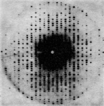 Two photographs of x-ray diffraction patterns are shown in Figs. 38–5 and 38–6; they illustrate scattering from rock salt and myoglobin, respectively.