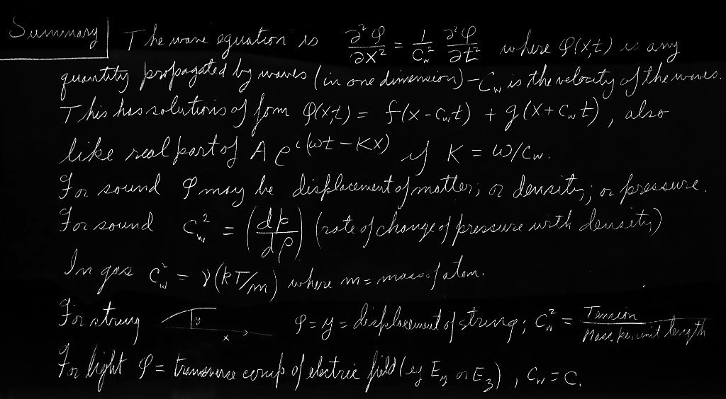 We find, therefore, from the laws of mechanics that any sound disturbance propagates with the velocity $c_s$, and in addition we find that \begin{equation*} c_s = \kappa^{1/2} = (dP/d\rho)_0^{1/2}, \end{equation*} and so we have related the wave velocity to a property of the medium.