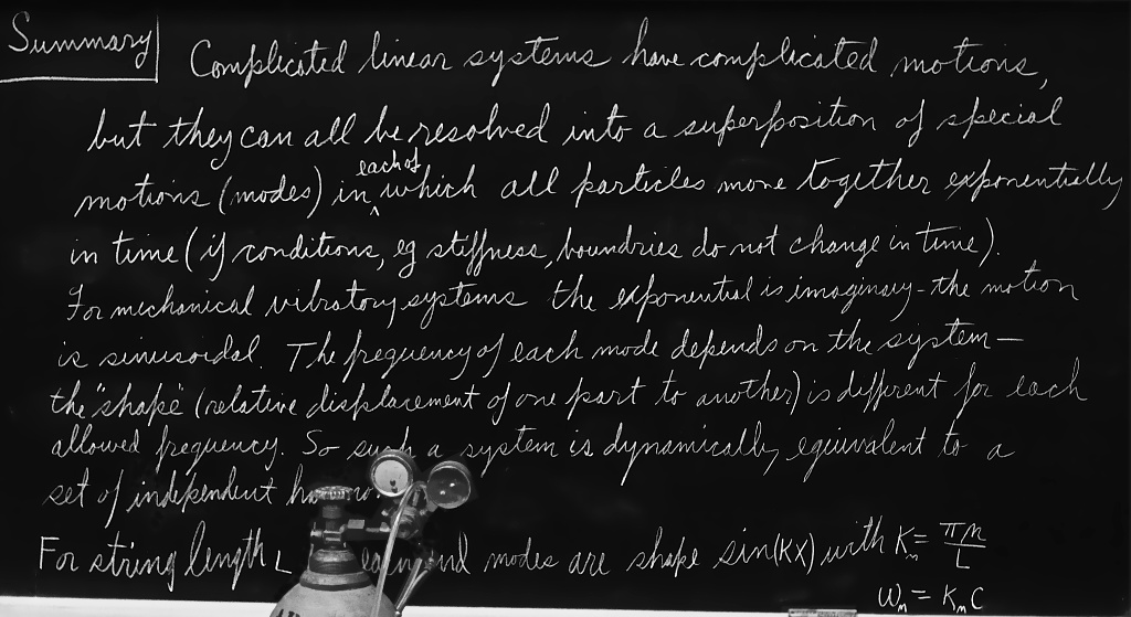 Now let us summarize the ideas discussed above, which are all aspects of what is probably the most general and wonderful principle of mathematical physics. If we have a linear system whose character is independent of the time, then the motion does not have to have any particular simplicity, and in fact may be exceedingly complex, but there are very special motions, usually a series of special motions, in which the whole pattern of motion varies exponentially with the time. For the vibrating systems that we are talking about now, the exponential is imaginary, and instead of saying “exponentially” we might prefer to say “sinusoidally” with time. However, one can be more general and say that the motions will vary exponentially with the time in very special modes, with very special shapes. The most general motion of the system can always be represented as a superposition of motions involving each of the different exponentials.