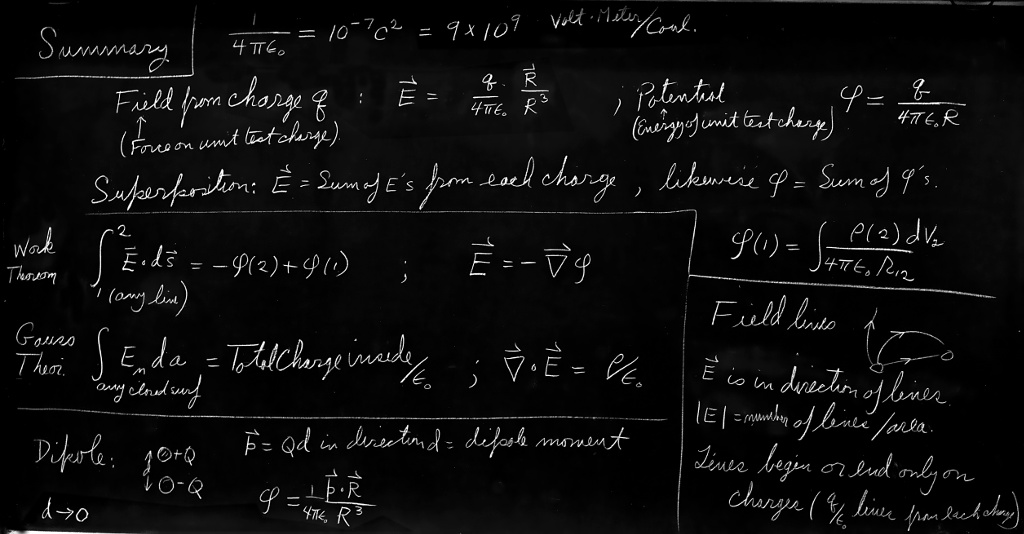 When there are more than two charges present—the only really interesting times—we must supplement Coulomb’s law with one other fact of nature: the force on any charge is the vector sum of the Coulomb forces from each of the other charges. This fact is called “the principle of superposition.” That’s all there is to electrostatics. If we combine the Coulomb law and the principle of superposition, there is nothing else. Equations (4.5) and (4.6)—the electrostatic equations—say no more and no less.