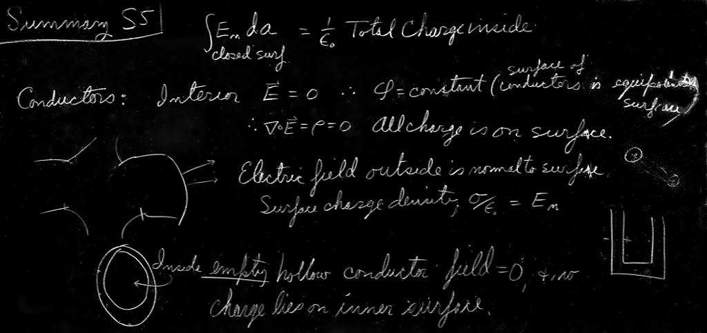 An electrical conductor is a solid that contains many “free” electrons. The electrons can move around freely in the material, but cannot leave the surface. In a metal there are so many free electrons that any electric field will set large numbers of them into motion. Either the current of electrons so set up must be continually kept moving by external sources of energy, or the motion of the electrons will cease as they discharge the sources producing the initial field. In “electrostatic” situations, we do not consider continuous sources of current (they will be considered later when we study magnetostatics), so the electrons move only until they have arranged themselves to produce zero electric field everywhere inside the conductor. (This usually happens in a small fraction of a second.) If there were any field left, this field would urge still more electrons to move; the only electrostatic solution is that the field is everywhere zero inside.