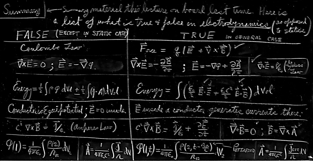It may be useful to make a few remarks about the table. First, you should notice that the equations we started with are the true equations—we have not misled you there. The electromagnetic force (often called the Lorentz force) $\FLPF=q(\FLPE+\FLPv\times\FLPB)$ is true. It is only Coulomb’s law that is false, to be used only for statics. The four Maxwell equations for $\FLPE$ and $\FLPB$ are also true. The equations we took for statics are false, of course, because we left off all terms with time derivatives.