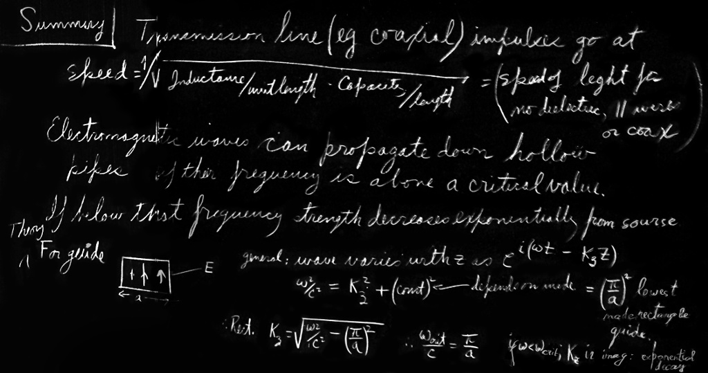 The wave velocity we have used above is the phase velocity, which is the speed of a node of the wave; it is a function of frequency. If we combine Eqs. (24.17) and (24.18), we can write \begin{equation} \label{Eq:II:24:25} v_{\text{phase}}=\frac{c}{\sqrt{1-(\omega_c/\omega)^2}}. \end{equation} For frequencies above cutoff—where travelling waves exist—$\omega_c/\omega$ is less than one, and $v_{\text{phase}}$ is real and greater than the speed of light. We have already seen in Chapter 48 of Vol. I that phase velocities greater than light are possible, because it is just the nodes of the wave which are moving and not energy or information. In order to know how fast signals will travel, we have to calculate the speed of pulses or modulations made by the interference of a wave of one frequency with one or more waves of slightly different frequencies (see Chapter 48, Vol. I). We have called the speed of the envelope of such a group of waves the group velocity; it is not $\omega/k$ but $d\omega/dk$: \begin{equation} \label{Eq:II:24:26} v_{\text{group}}=\ddt{\omega}{k}. \end{equation} Taking the derivative of Eq. (24.17) with respect to $\omega$ and inverting to get $d\omega/dk$, we find that \begin{equation} \label{Eq:II:24:27} v_{\text{group}}=c\sqrt{1-(\omega_c/\omega)^2}, \end{equation} which is less than the speed of light.