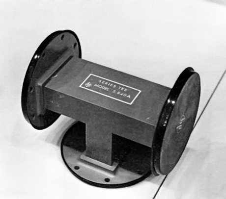 The problem of connecting a “circuit” with waveguides is quite different from the corresponding circuit problem at low frequencies, and is usually called microwave “plumbing.” Many special devices have been developed for the purpose. For instance, two sections of waveguide are usually connected together by means of flanges, as can be seen in Fig. 24–9. Such connections can, however, cause serious energy losses, because the surface currents must flow across the joint, which may have a relatively high resistance. One way to avoid such losses is to make the flanges as shown in the cross section drawn in Fig. 24–10. A small space is left between the adjacent sections of the guide, and a groove is cut in the face of one of the flanges to make a small cavity of the type shown in Fig. 23–16(c). The dimensions are chosen so that this cavity is resonant at the frequency being used. This resonant cavity presents a high “impedance” to the currents, so relatively little current flows across the metallic joints (at $a$ in Fig. 24–10). The high guide currents simply charge and discharge the “capacity” of the gap (at $b$ in the figure), where there is little dissipation of energy.