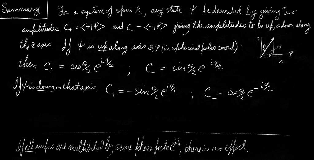 As our final example, suppose that we know that a spin one-half particle is in a state $\psi$ such that it is polarized “up” along some axis $A$, defined by the angles $\theta$ and $\phi$ in Fig. 6-10. We want to know the amplitude $C_+$ that the particle is “up” along $z$ and the amplitude $C_-$ that it is “down” along $z$. We can find these amplitudes by imagining that $A$ is the $z$-axis of a system whose $x$-axis lies in some arbitrary direction—say in the plane formed by $A$ and $z$. We can then bring the frame of $A$ into $x$, $y$, $z$ by three rotations. First, we make a rotation by $-\pi/2$ about the axis $A$, which brings the $x$-axis into the line $B$ in the figure. Then we rotate by $\theta$ about line $B$ (the new $x$-axis of frame $A$) to bring $A$ to the $z$-axis. Finally, we rotate by the angle $(\pi/2-\phi)$ about $z$. Remembering that we have only a $(+)$ state with respect to $A$, we get \begin{equation} \label{Eq:III:6:36} C_+=\cos\frac{\theta}{2}\,e^{-i\phi/2},\quad C_-=\sin\frac{\theta}{2}\,e^{+i\phi/2}. \end{equation}
