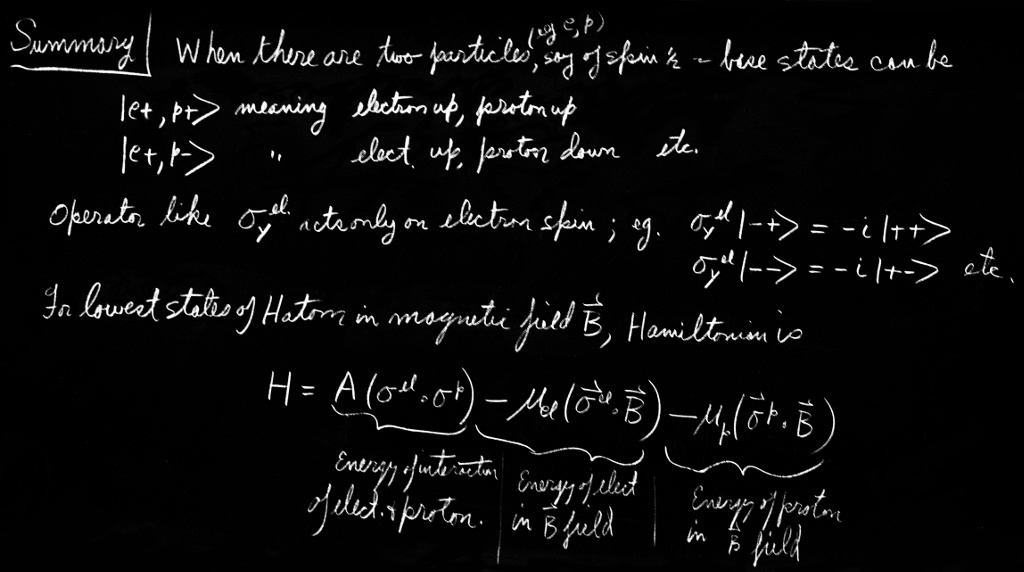 In this chapter we take up the “hyperfine splitting” of hydrogen, because it is a physically interesting example of what we can already do with quantum mechanics. It’s an example with more than two states, and it will be illustrative of the methods of quantum mechanics as applied to slightly more complicated problems. It is enough more complicated that once you see how this one is handled you can get immediately the generalization to all kinds of problems.