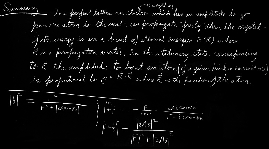 We have now explained a remarkable mystery—how an electron in a crystal (like an extra electron put into germanium) can ride right through the crystal and flow perfectly freely even though it has to hit all the atoms. It does so by having its amplitudes going pip-pip-pip from one atom to the next, working its way through the crystal. That is how a solid can conduct electricity.