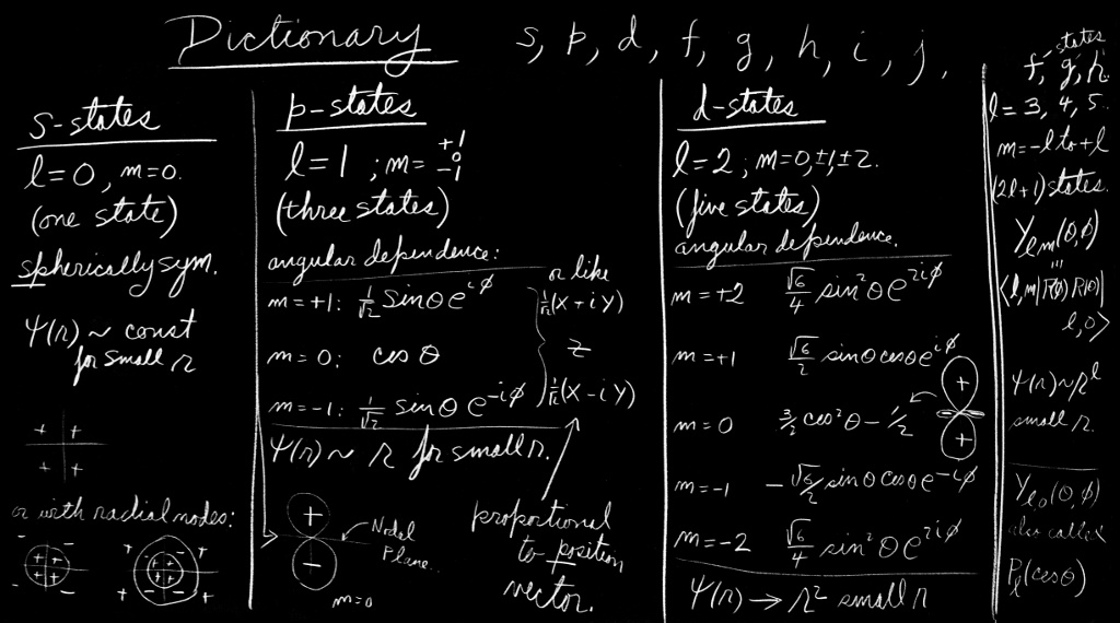 If the orbital angular momentum is zero, then there is no change when you rotate the coordinate system and there is no variation with angle—the “dependence” on angle is as a constant, say $1$. This is also called an “$s$-state”, and there is only one such state—as far as angular dependence is concerned. If the orbital angular momentum is $1$, then the amplitude of the angular variation may be any one of the three functions given—depending on the value of $m$—or it may be a linear combination. These are called “$p$-states,” and there are three of them. If the orbital angular momentum is $2$ then there are the five functions shown. Any linear combination is called an “$l=2$,” or a “$d$-wave” amplitude. Now you can immediately guess what the next letter is—what should come after $s$, $p$, $d$? Well, of course, $f$, $g$, $h$, and so on down the alphabet! The letters don’t mean anything. (They did once mean something—they meant “sharp” lines, “principal” lines, “diffuse” lines and “fundamental” lines of the optical spectra of atoms. But those were in the days when people did not know where the lines came from. After $f$ there were no special names, so we now just continue with $g$, $h$, and so on.)