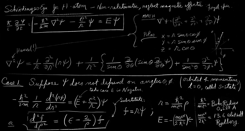 Now if $\psi$ is not going to depend on $\theta$ and $\phi$ then the entire Laplacian contains only the first term and Eq. (19.7) becomes much simpler: \begin{equation} \label{Eq:III:19:8} \frac{1}{r}\,\frac{d^2}{dr^2}\,(r\psi)= -\frac{2m}{\hbar^2}\biggl(E+\frac{e^2}{r}\biggr)\psi. \end{equation} Before you start to work on solving an equation like this, it’s a good idea to get rid of all excess constants like $e^2$, $m$, and $\hbar$, by making some scale changes. Then the algebra will be easier. If we make the following substitutions: \begin{equation} \label{Eq:III:19:9} r=\frac{\hbar^2}{me^2}\,\rho, \end{equation} and \begin{equation} \label{Eq:III:19:10} E=\frac{me^4}{2\hbar^2}\,\epsilon, \end{equation} then Eq. (19.8) becomes (after multiplying through by $\rho$) \begin{equation} \label{Eq:III:19:11} \frac{d^2(\rho\psi)}{d\rho^2}= -\biggl(\epsilon+\frac{2}{\rho}\biggr)\rho\psi. \end{equation} These scale changes mean that we are measuring the distance $r$ and energy $E$ as multiples of “natural” atomic units. That is, $\rho=r/r_B$, where $r_B=\hbar^2/me^2$, is called the “Bohr radius” and is about $0.528$ angstroms. Similarly, $\epsilon=E/E_R$, with $E_R=me^4/2\hbar^2$. This energy is called the “Rydberg” and is about $13.6$ electron volts.